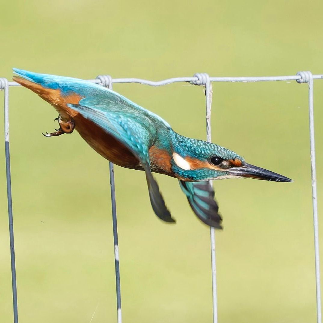 A Common Kingfisher (Alcedo atthis) is captured in mid-flight, diving or taking off from a wire fence. Its brilliant turquoise and rusty-orange plumage are striking against a soft green background. #Birds #lukehaigh #birdwatching #photography