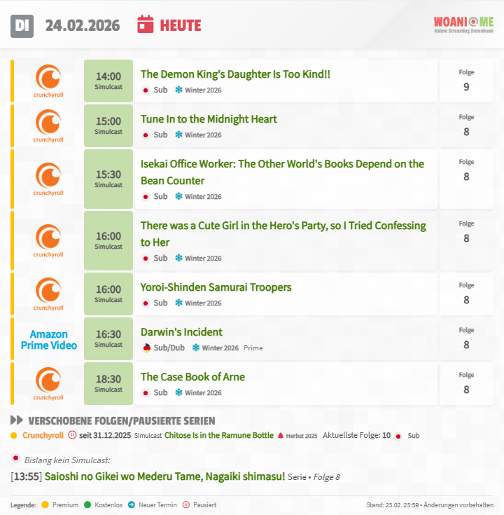Das #Anime #Streaming Programm für Dienstag, den 24.02.