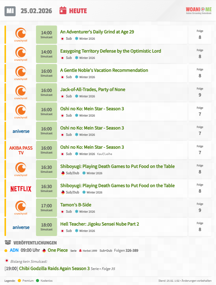 Das #Anime #Streaming Programm für Mittwoch, den 25.02.