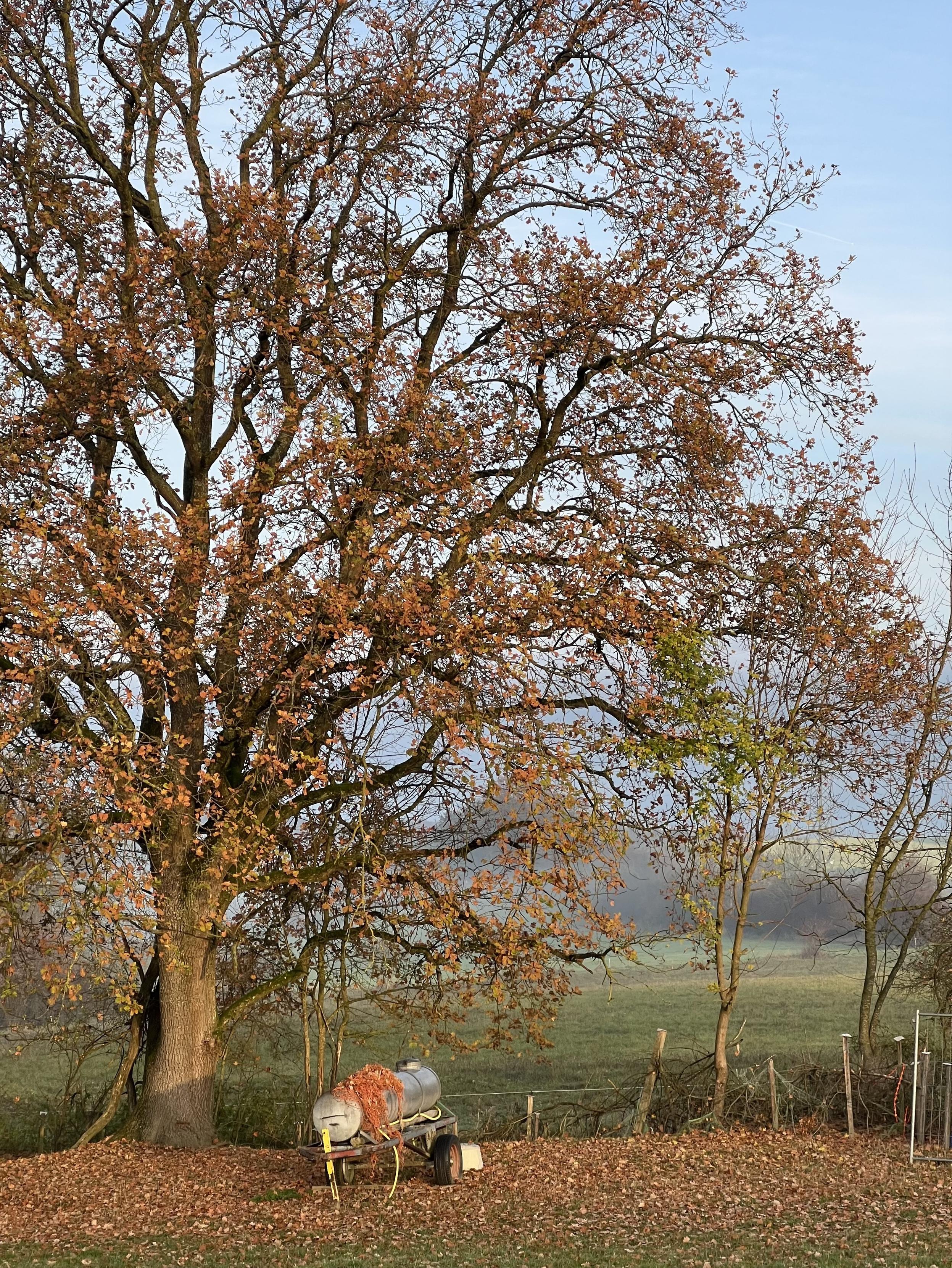 Die gleiche Aufnahme wie das vorige Bild an einem anderen Tag aufgenommen. Ein großer Baum mit vertrockneten Blättern, darunter eine Viehtränke auf einem Anhänger. Die frühe Morgensonne taucht alles in ein goldenes Licht. Im Hintergrund Äcker und Wiesen, von denen leichter Morgendunst aufsteigt