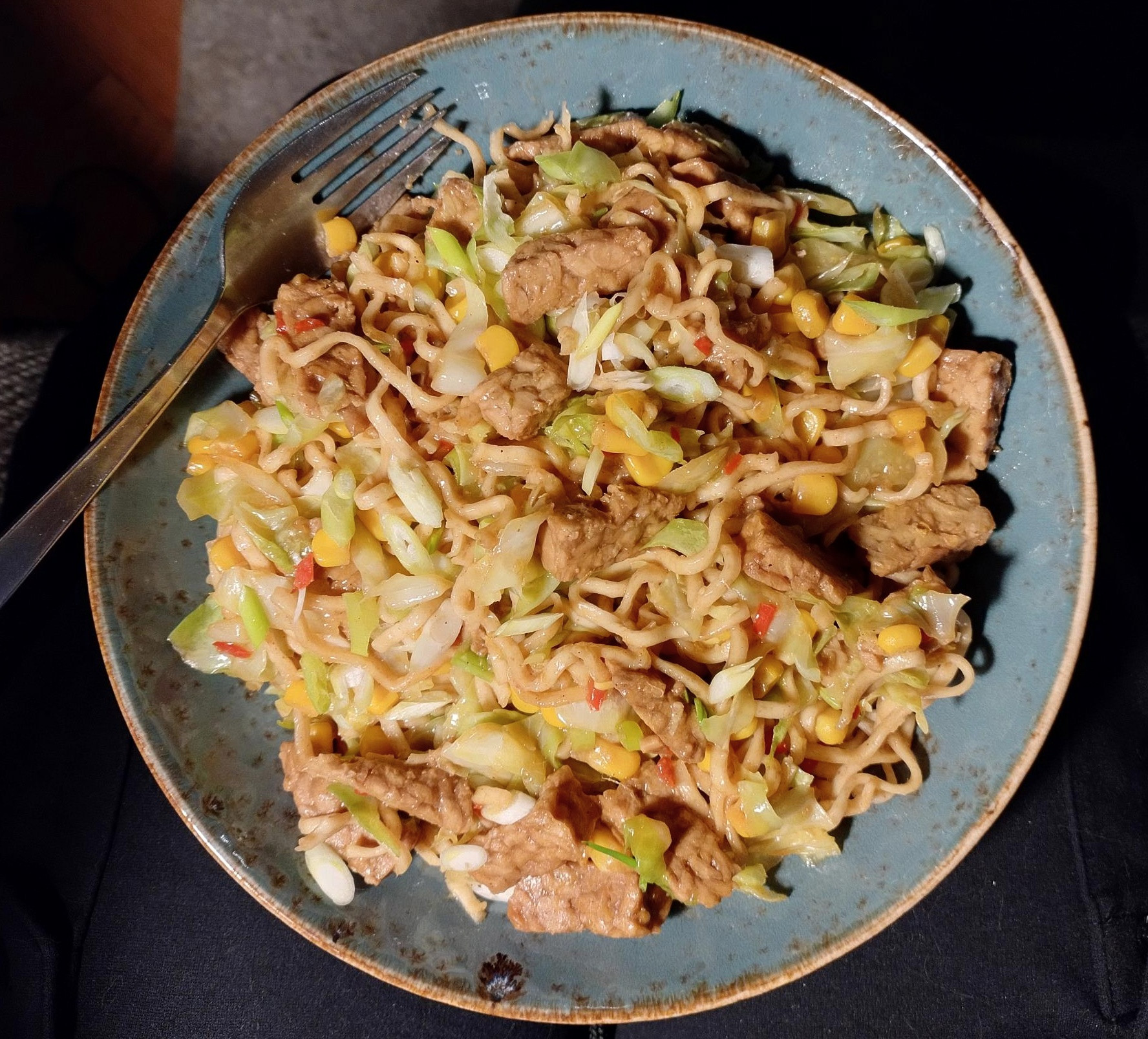 Kitchen-foraged an old favourite for last night's meal. Ching-he Huang's Five spice seitan, sweetheart cabbage, sweetcorn & chilli, tweaked as per: soy marinated tempeh subbed for seitan & noodles added.