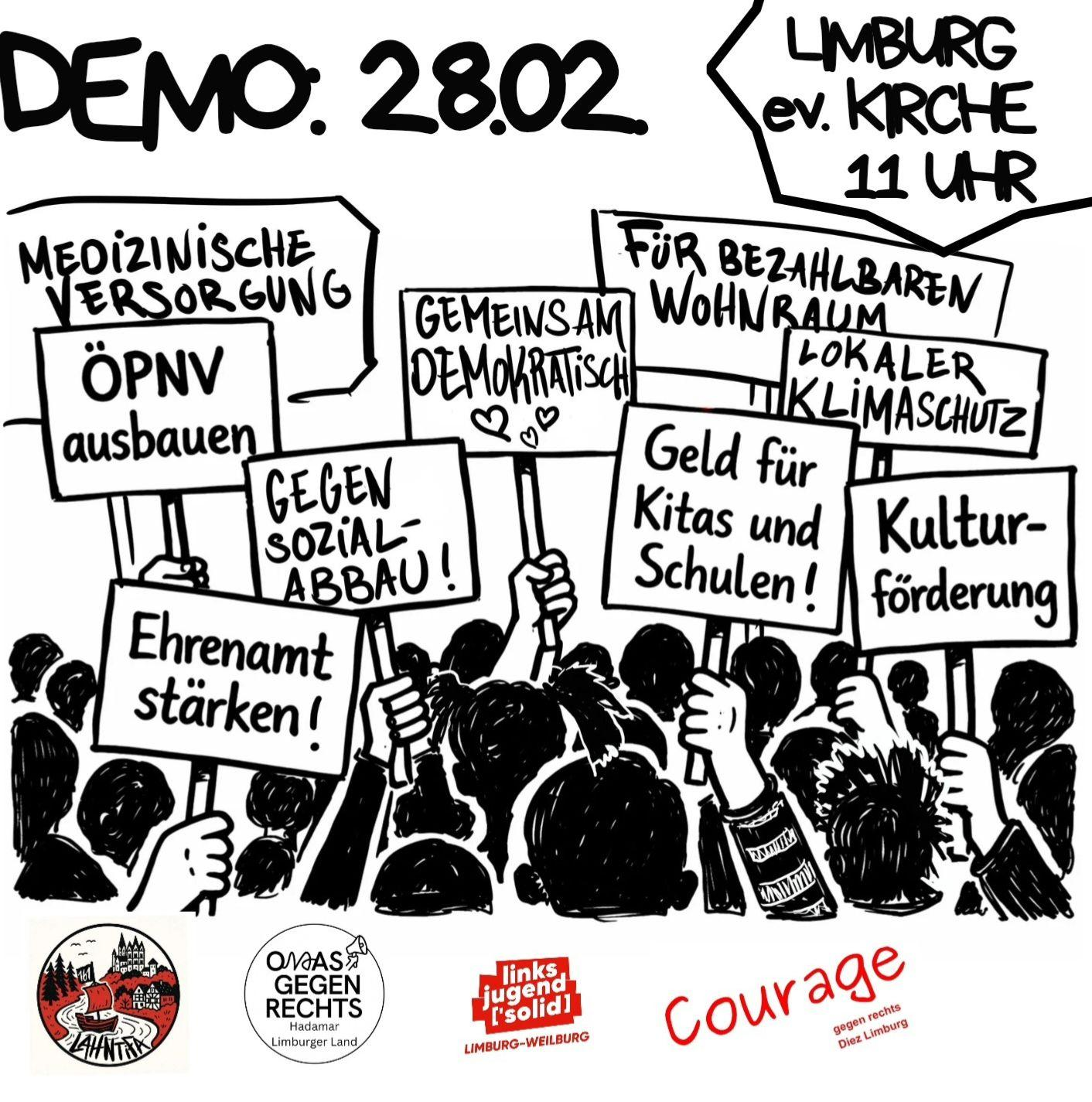 Lahntifa, Omas gegen Rechts, Linksjugend ['solid] und Bündnis Courage demonstrieren am kommenden Sa. 28.2. in der Limburger Innenstadt gemeinsam demokratisch gegen Sozialabbau und Aufrüstung, für bezahlbaren Wohnraum, gute medizinische Versorgung, Ausbau des ÖPNV, Klimaschutz, mehr Geld für Kitas und Schulen und Kulturförderung!