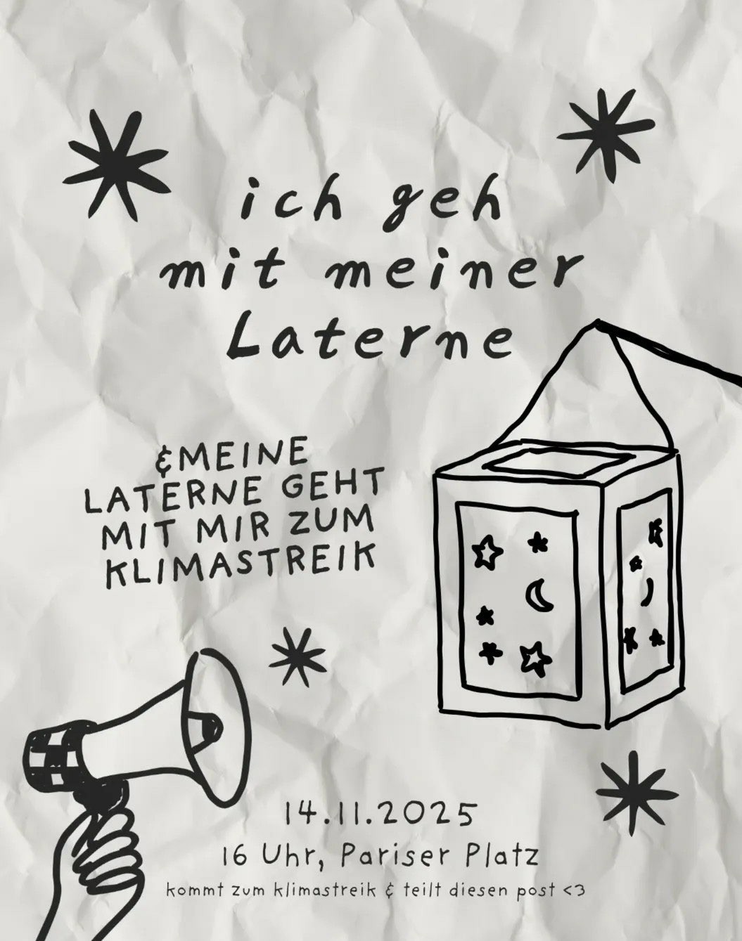 Zeichnung: Ein Megaphon und eine Martinslaterne. Schrift: ich geh mit meiner Laterne meine Laterne geht mit mir zum Klimastreik 14.11.25 16:00 Pariser Platz kommt zum Klimastreik und teilt diesen Post