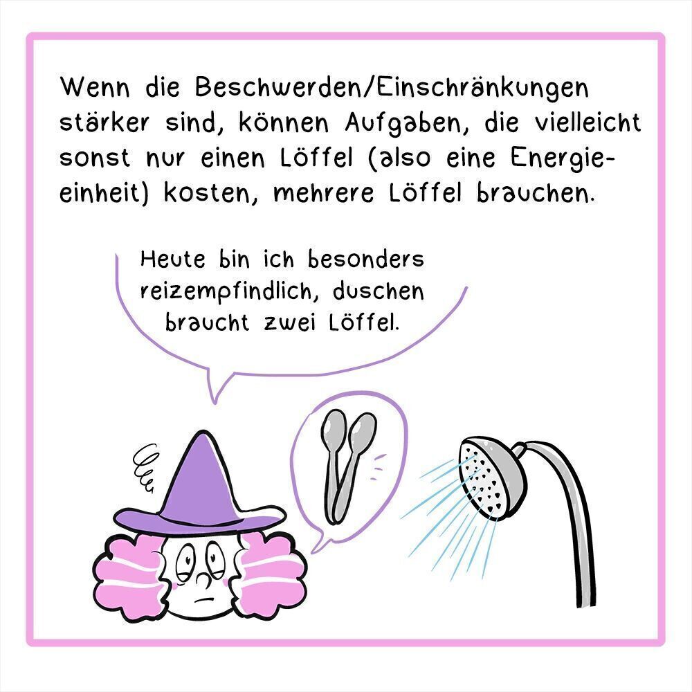 Wenn die Beschwerden/Einschränkungen stärker sind, können Aufgaben, die vielleicht sonst nur einen Löffel (also eine Energieeinheit) kosten, mehrere Löffel brauchen.