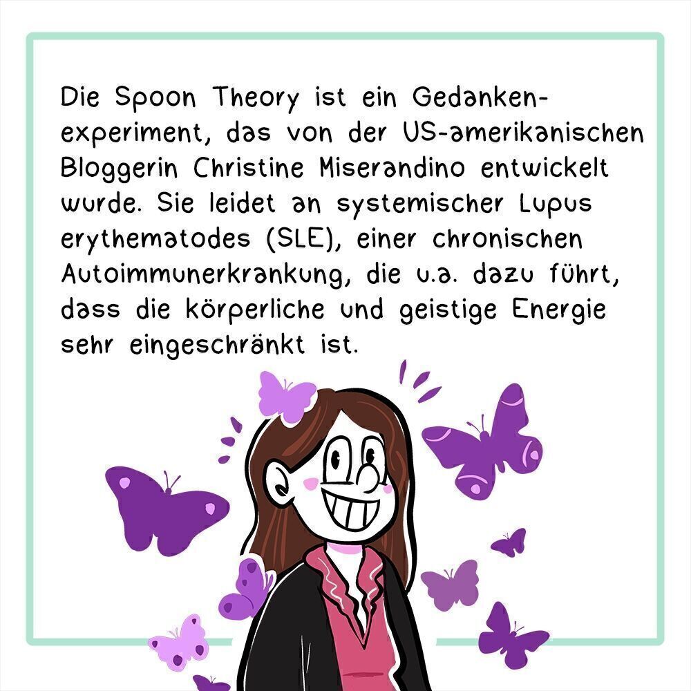 2. Panel Die Spoon Theory ist ein Gedankenexperiment, das von der US-amerikanischen Bloggerin Christine Miserandino entwickelt wurde. Sie leidet an systemischer Lupus erythematodes (SLE), einer chronischen Autoimmunerkrankung, die u.a. dazu führt, dass die körperliche und geistige Energie sehr eingeschränkt ist. Illustration: Eine Frau mit braunen langen Haaren lächelt, sie trägt eine schwarze Bluse und ist umringt von violetten Schmetterlingen (Die Schmetterlinge sind ein Symbol für für Lupus)