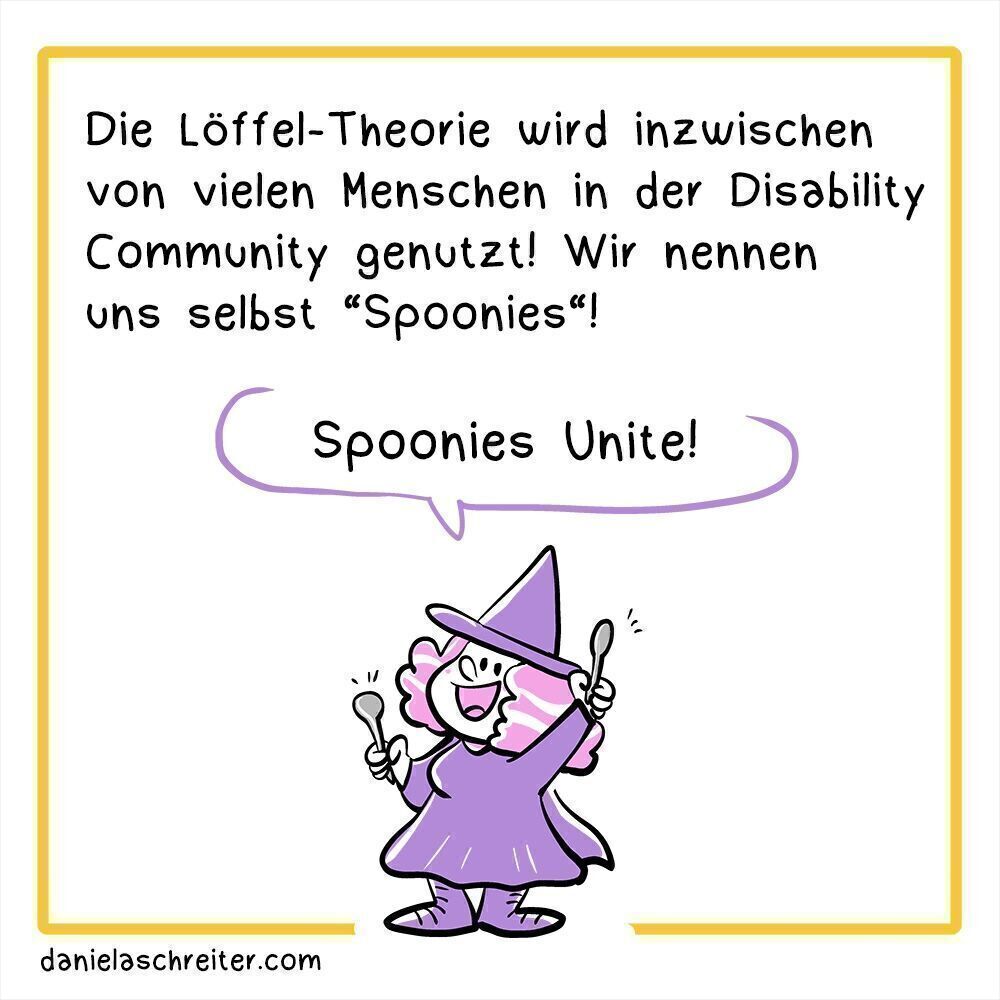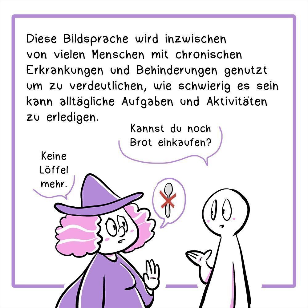 4. Panel Diese Bildsprache wird inzwischen von vielen Menschen mit chronischen Erkrankungen und Behinderungen genutzt um zu verdeutlichen, wie schwierig es sein kann alltägliche Aufgaben und Aktivitäten zu erledigen. Illustration: Zwei Personen sind abgebildet, eine davon ist eine Hexe mit violetter Kleidung und Hexenhut. Die eine Person fragt die Hexe: „Könntest du einkaufen gehen?“ Die Hexe erwidert: „Entschuldige, dafür habe ich keine Löffel mehr…“ Sie hebt dabei abwehrend eine Hand hoch.