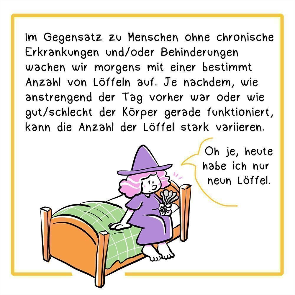 5. Panel Im Gegensatz zu Menschen ohne chronische Erkrankungen und/oder Behinderungen wachen wir morgens mit einer bestimmt Anzahl von Löffeln auf. Je nachdem, wie anstrengend der Tag vorher war oder wie gut/schlecht der Körper gerade funktioniert, kann die Anzahl der Löffel stark variieren. Illustration: Die Hexe wacht auf und sitzt auf ihrem Bett. In ihrer Hand hält sie mehrere Löffel. Sie sagt: „Oh je, heute habe ich nur 9 Löffel zur Verfügung.“