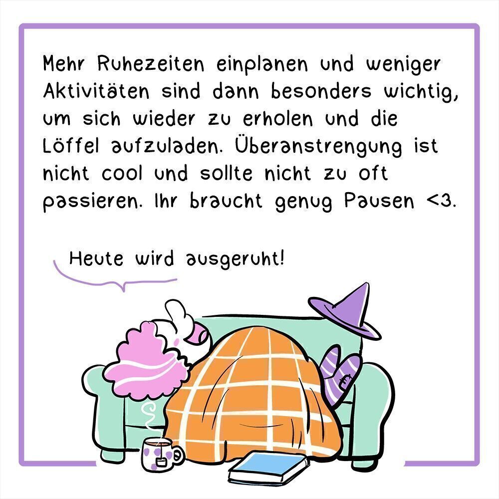 9. Bild Mehr Ruhezeiten einplanen und weniger Aktivitäten sind dann besonders wichtig, um sich wieder zu erholen und die Löffel aufzuladen. Überanstrengung und Überforderung sind nicht cool und sollten nicht zu oft passieren. Ihr braucht genug Pausen!