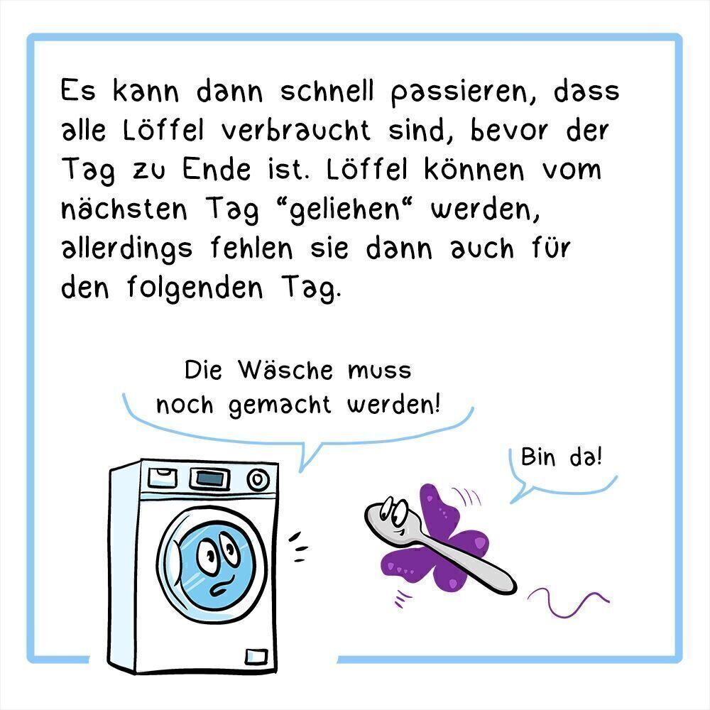 8. Bild Es kann dann schnell passieren, dass alle Löffel verbraucht sind, bevor der Tag zu Ende ist. Löffel können vom nächsten Tag „geliehen“ werden, allerdings fehlen sie dann auch für den folgenden Tag. Illustration: Hexe: Eine Waschmaschine mit Gesicht ist abgebildet, sie sagt: „Die Wäsche muss noch gemacht werden“. Ein Löffel Löffel fliegt herbei und sagt: „Bin da!“