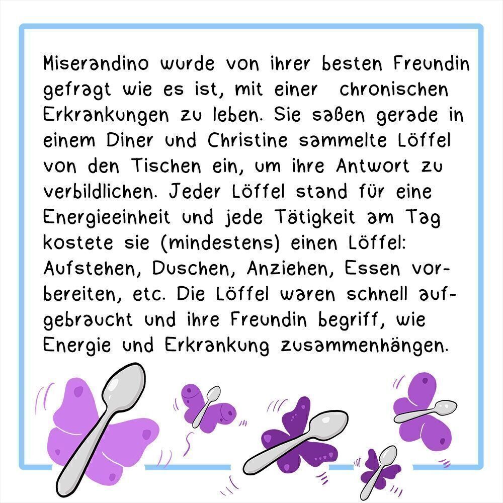 Miserandino wurde von ihrer besten Freundin gefragt wie es ist, mit einer chronischen Erkrankungen zu leben. Sie saßen in einem Diner und Christine sammelte Löffel von den Tischen ein, um ihre Antwort zu veranschaulichen. Jeder Löffel stand für eine Energieeinheit und jede Tätigkeit kostete sie (mindestens) einen Löffel: Aufstehen, Duschen, Anziehen, Essen vorbereiten, etc. Die Hälfte der Löffel waren schon aufgebraucht, bevor sie überhaupt das Haus verlässt und die Freundin begriff, wie Energie und Erkrankung zusammenhängen.