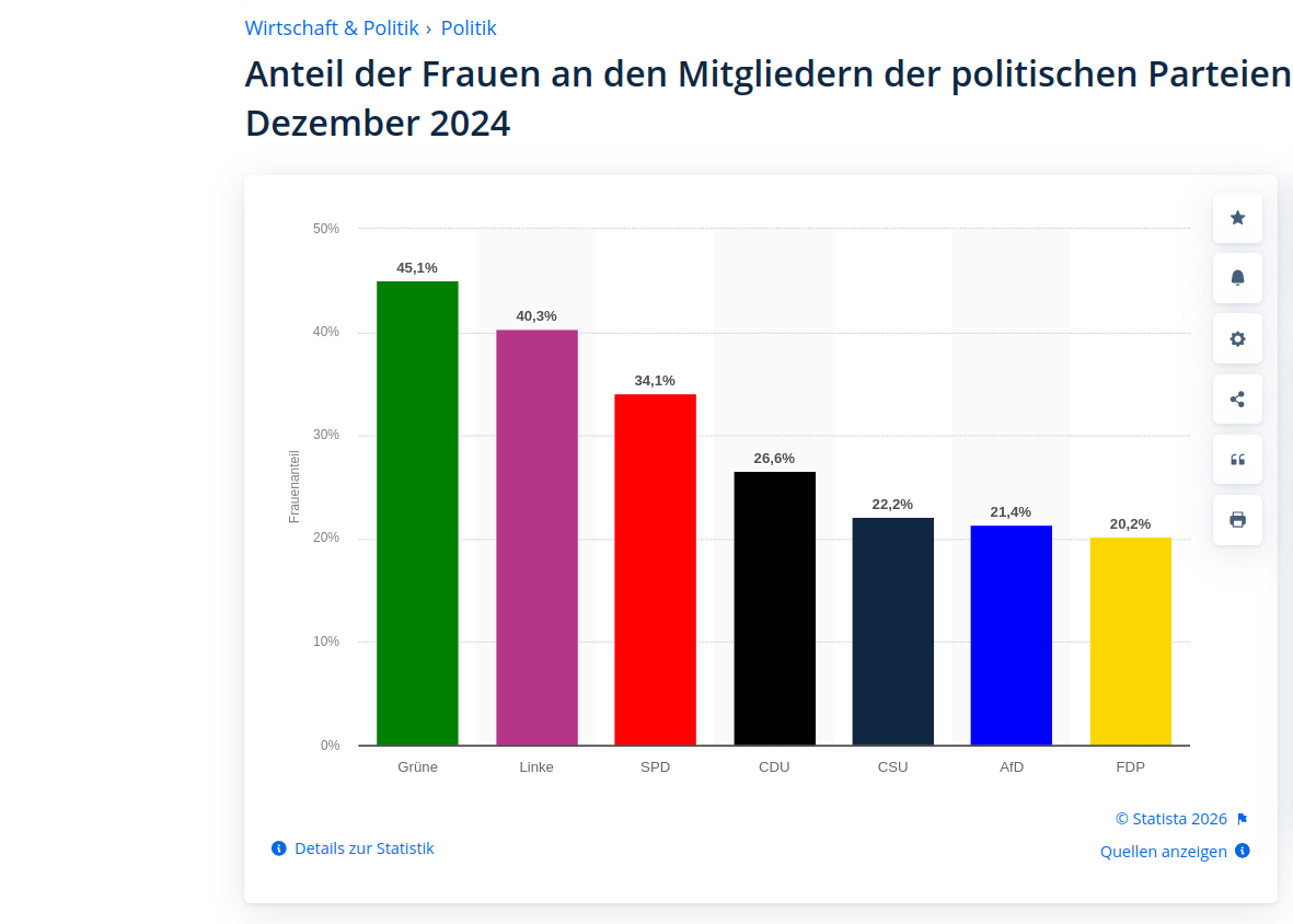 https://de.statista.com/statistik/daten/studie/192247/umfrage/frauenanteil-in-den-politischen-parteien/