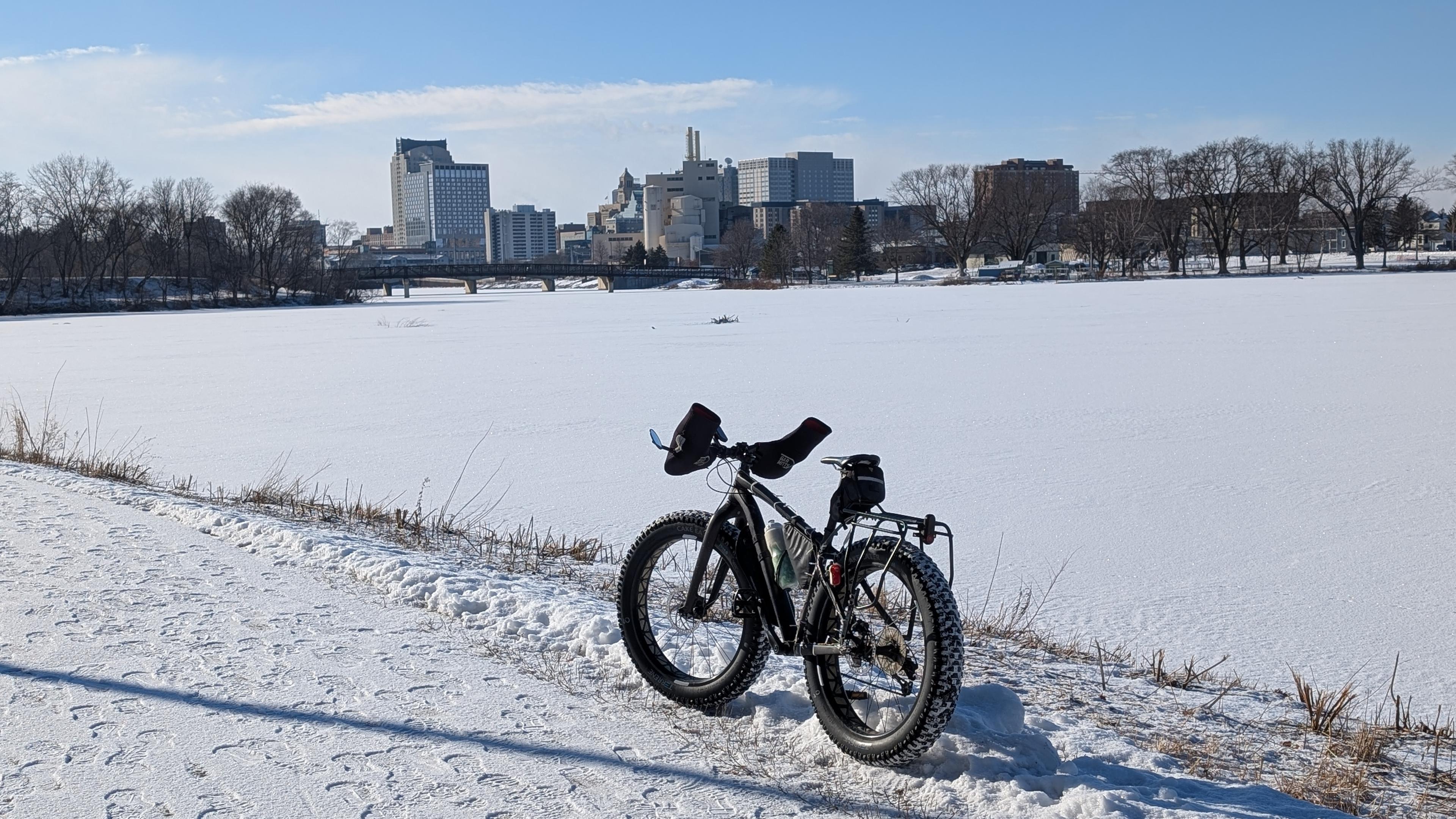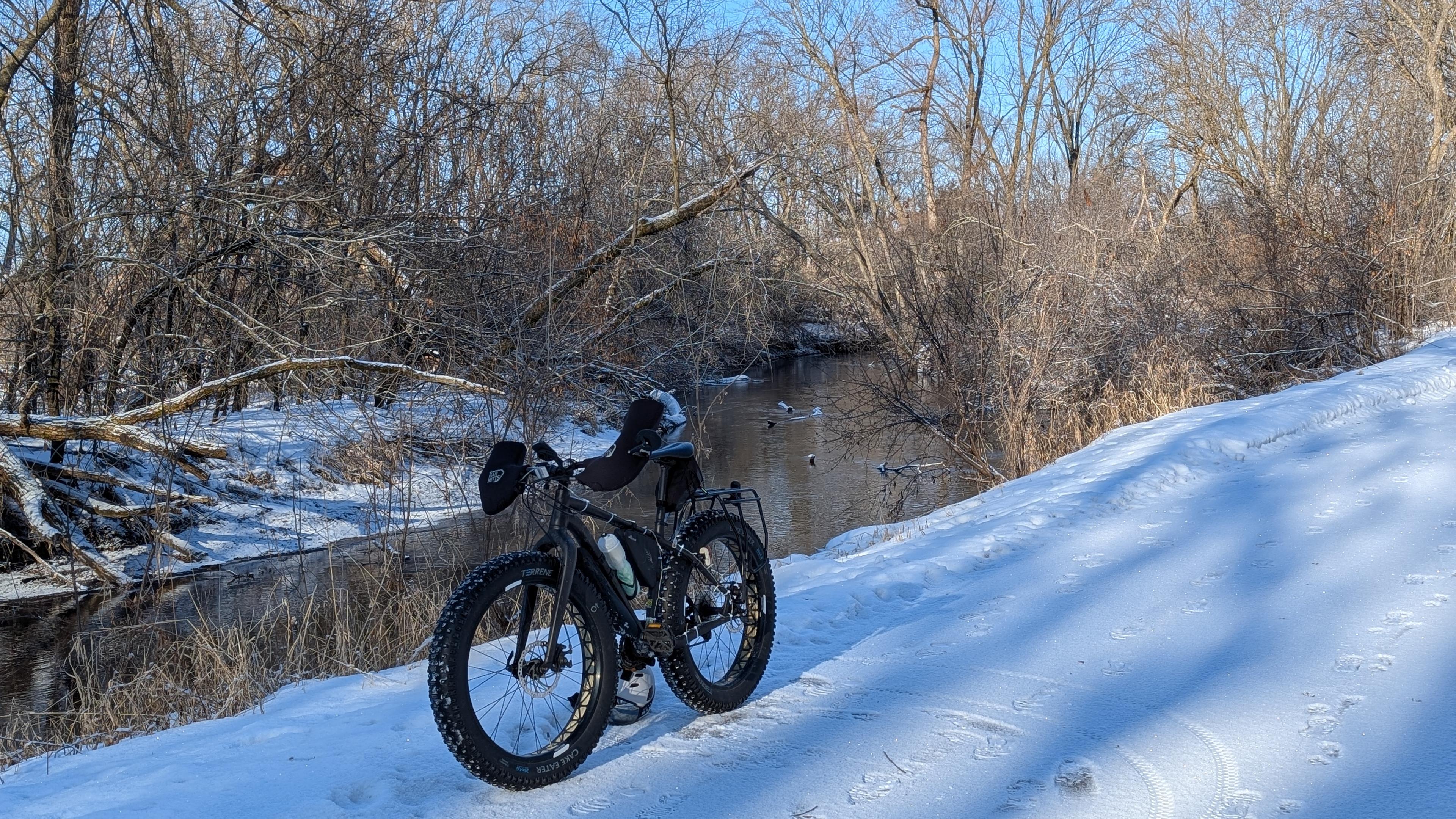 It is back to winter reality as the temperatures are below freezing again and we had a half inch (1 cm) of dry fluffy snow overnight. That was a relief as there isn't ice underneath, except where some remained after the thaw. I rode my fat bike with studded tires because you can't see the remaining ice under the new snow. I did a quick ride up the trails and around Silver Lake for 11 miles. The LBS is finished with my road and gravel bikes so I'll go pick them up this afternoon.