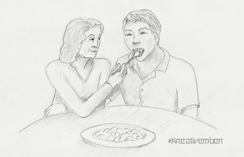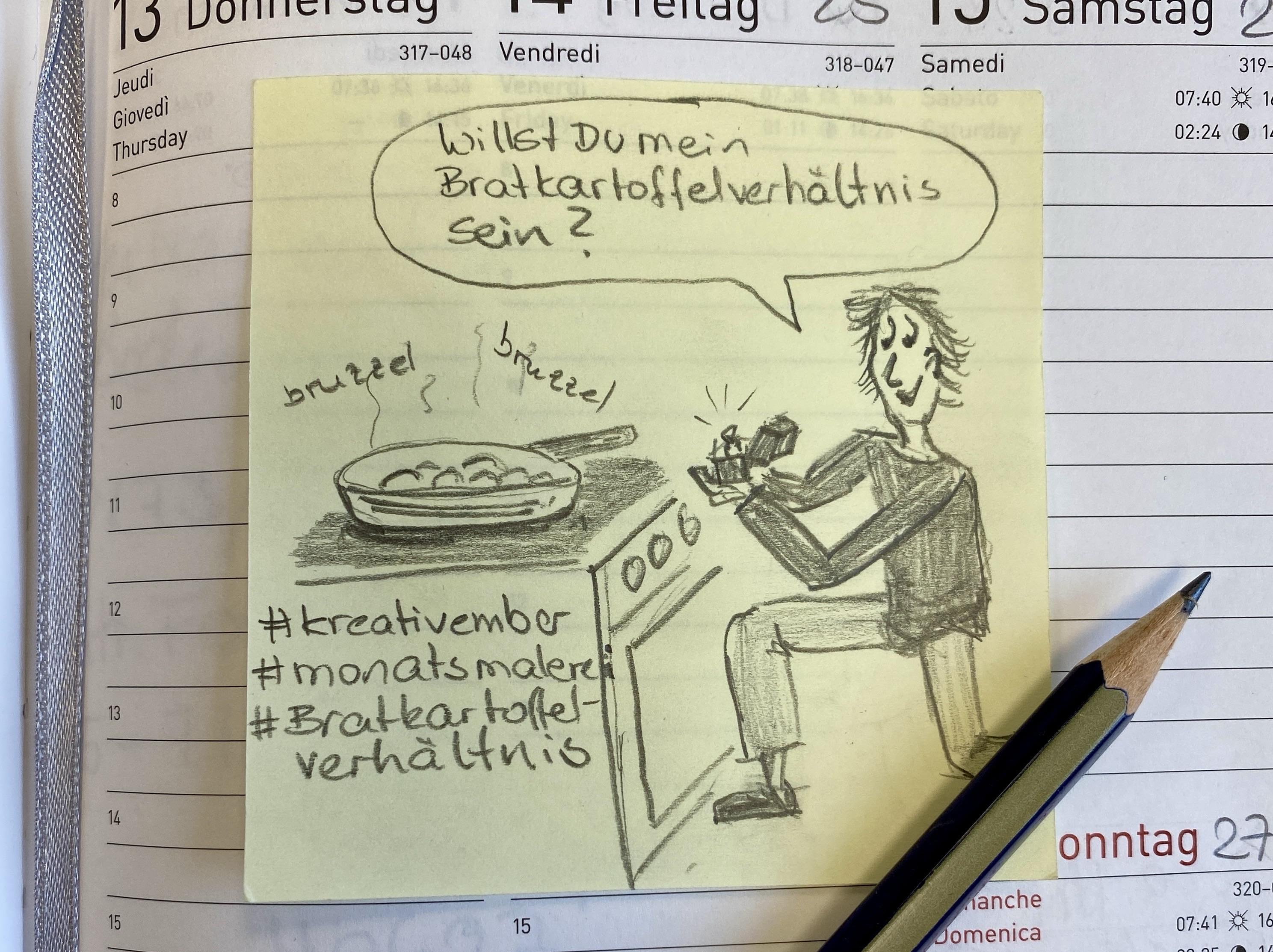 ...und so genossen Witwe Schabowski und der junge Fritz ungeniert ihre Freundschaft plus. Sie kochte gut, er war handwerklich geschickt - beide pfiffen auf gesellschaftliche Konventionen. #MonatsMalerei #Kreativember Fr 14 Bratkartoffelverhältnis.