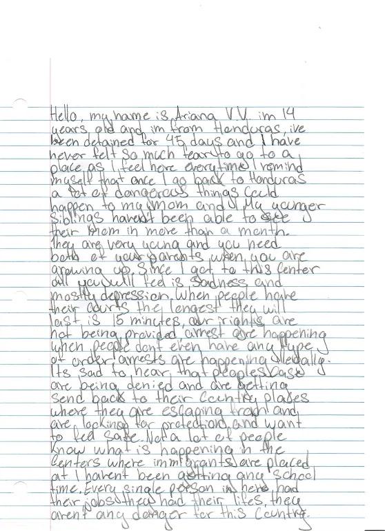 “Hello, my name is Ariana V.V. I'm 14 years old and I'm from Honduras, I've been detained for 45 days and I have never felt so much fear to go to a place as I feel here every time I remind myself that once I go back to Honduras a lot of dangerous things could happen to my mom and my younger siblings haven’t been able to see their mom in more than a month. They are very young and you need both of your parents when you are growing up. Since I got to this center all you will feel is sadness and mostly depression. When people have their courts the longest they will last is 15 minutes, our rights are not being provided, arrest are happening when people don’t even have any type of order, arrests are happening illegally.