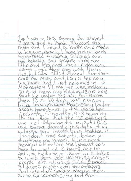 I've been in this country for almost 7 years and in those 7 years my mom and I found a home and made a bigger family. I have never been separated from my siblings and its honestly sad because they are little and they need their mom and sister, yeah they are with their dad but its still different for them and my mom and I. Since the day my mom and I get detained in Manhattan NY, my life was instantly paused, from my knowledge you can’t be under custody for more than 15 or 20 days, well here in Dilley Immigration Processing Center people have been in this place for 7 months, 5 months, 4-2 months, it's not fair that the ICE officers are not following the laws. All kids are being damage mentally, they witness how they’ve been treated.