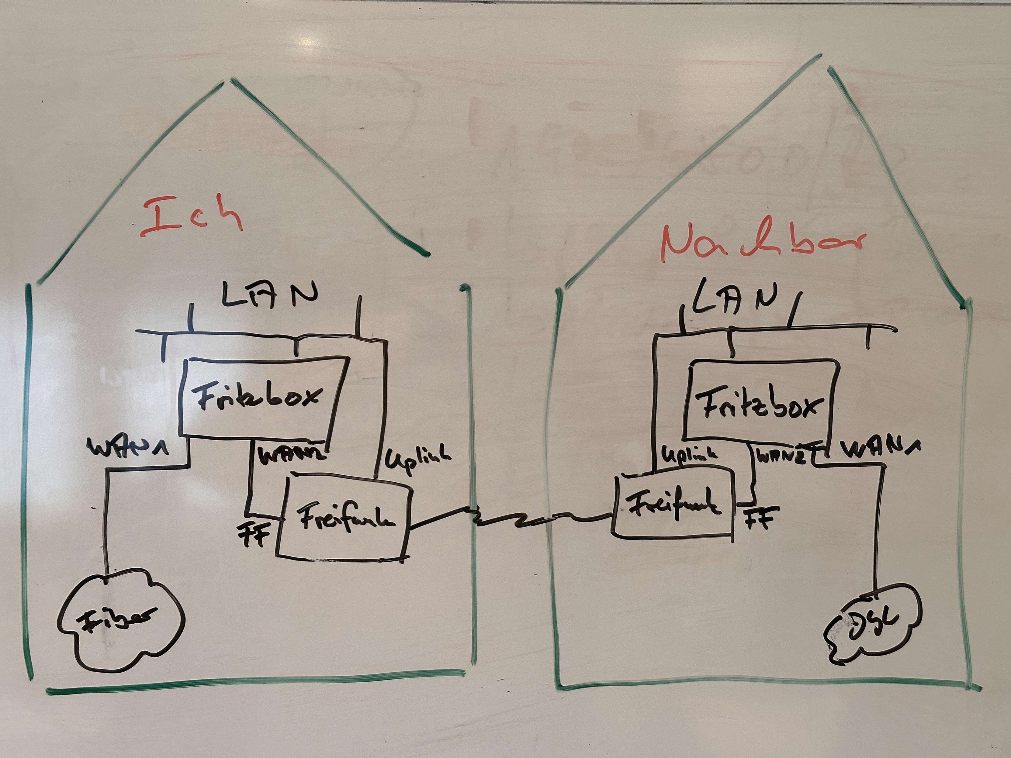 Wo wir's gerade von #Freifunk haben, hier ein Konzept, das ich neulich ans Whiteboard gekritzelt und gestern einem Freund gezeigt habe, bei dem Vodafone-Kabel aktuell down ist, und der sich mühselig mit irgendwelcher Althardware ans DSL eines Nachbarn geklöppelt hat. (Mehr in der Bildbeschreibung.)