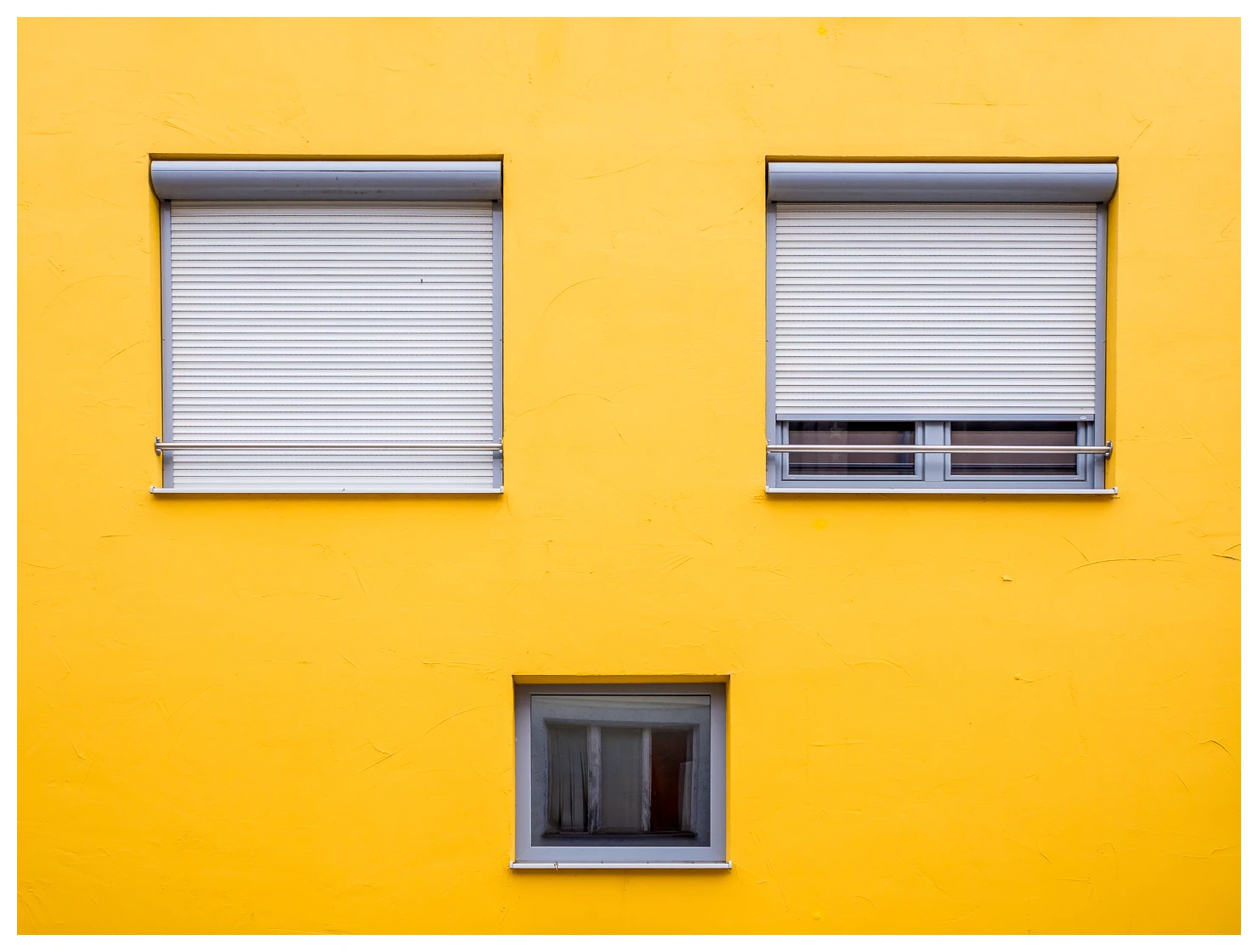 Ausschnitt einer Hauswand, dottergelb. Darauf drei Fenster, zwei oben, eins unten - jeweils über die Breite ausgemittelt. Die oberen zwei etwas größer, Rollos geschossen. Das untere ohne Rollo.
