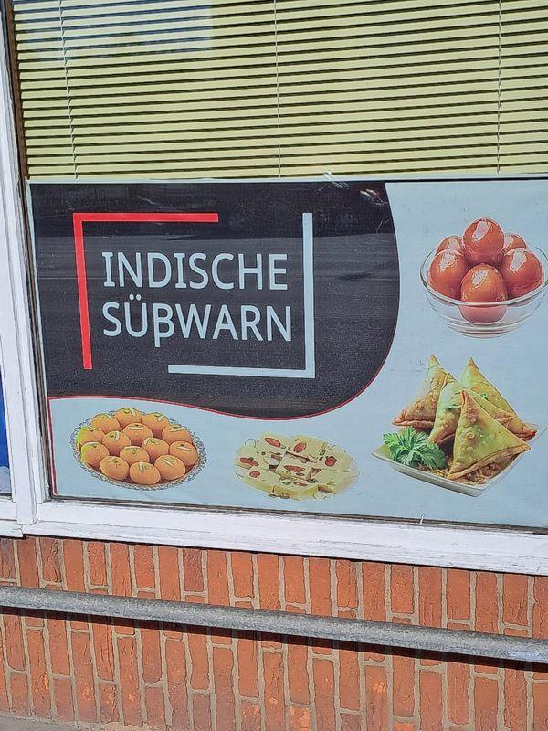 Ausschnitt eines Ladenfensters mit leicht abgeschlagenem weißem Holzrahmen über einem roten Klinkersockel und einem quer verlaufenden Metallrohr als Geländer. Eine gelbliche Jalousie mit schmalen Lamellen ist heruntergelassen. In der unteren Fensterhälfte steht eine Tafel, darauf vier freigestellte Bilder mit glasierten Kuchen und Teigtaschen und der Schriftzug „INDISCHE SÜẞWARN“