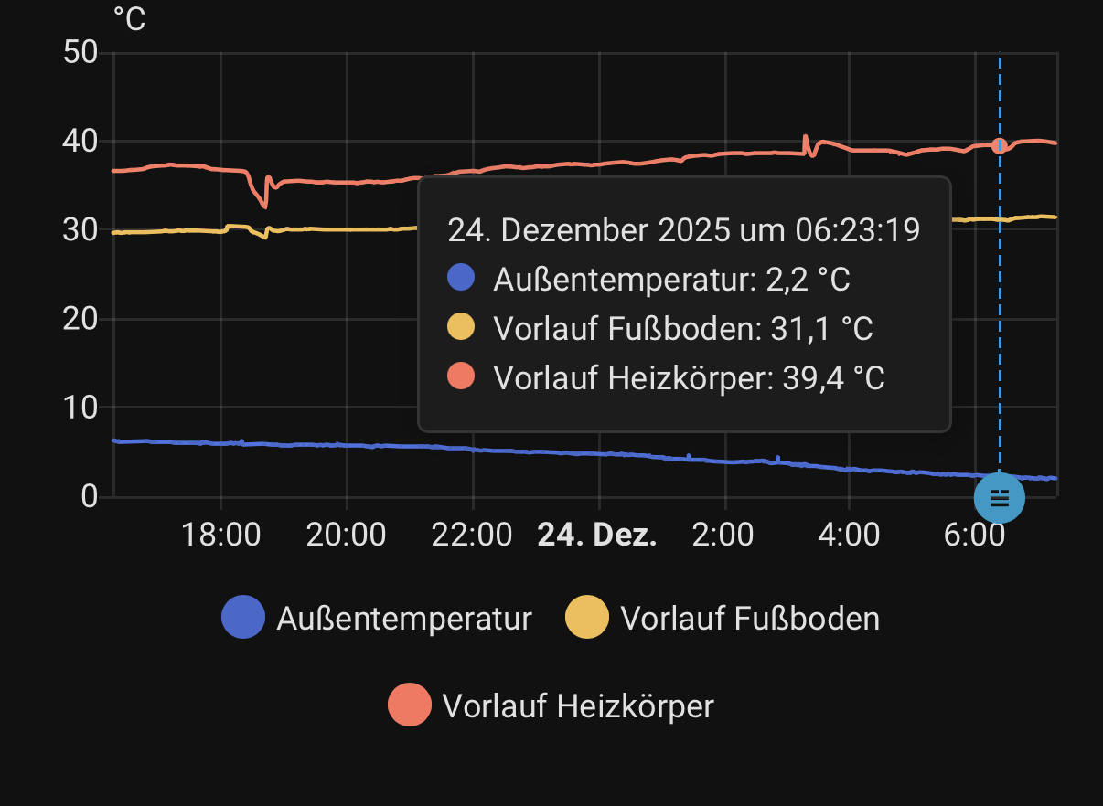 Oben mit Heizkörpern reichen 39.4 Grad Vorlauf für 20 Grad Raumtemperatur, 23 Grad im Bad.