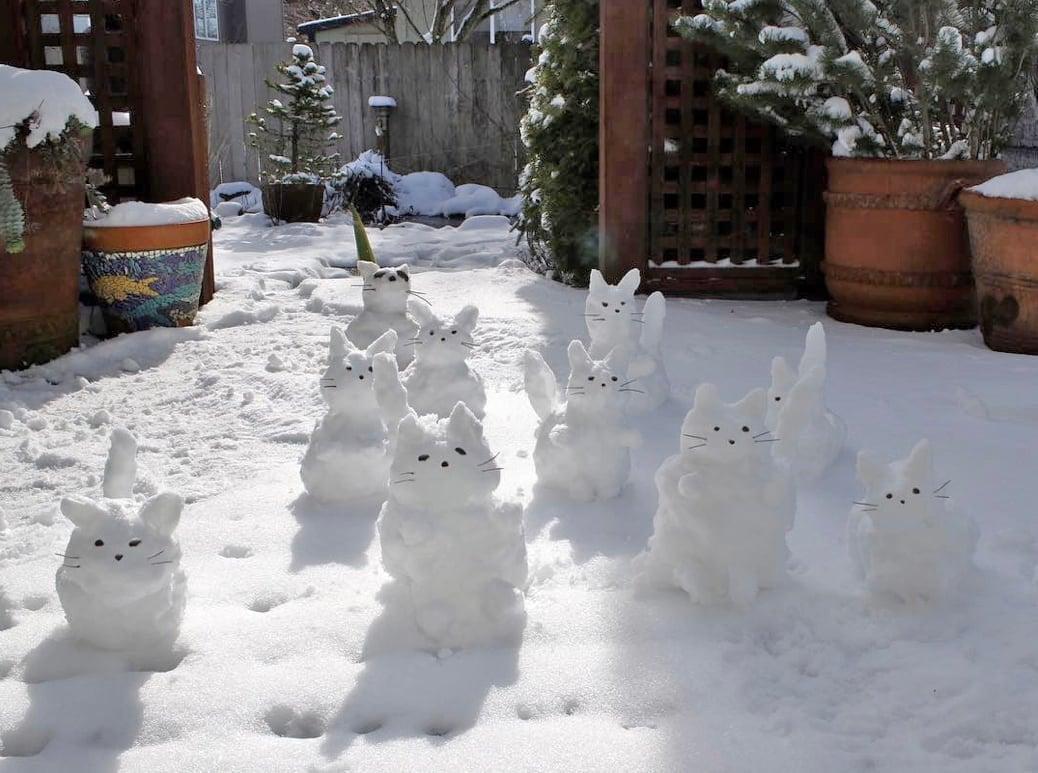Why make one snowman when you can build a whole battalion of cats? This garden has been completely taken over by a crowd of tiny, wide-eyed snow kittens, each with its own little tail and whiskers, creating a scene that is almost too cute to melt.