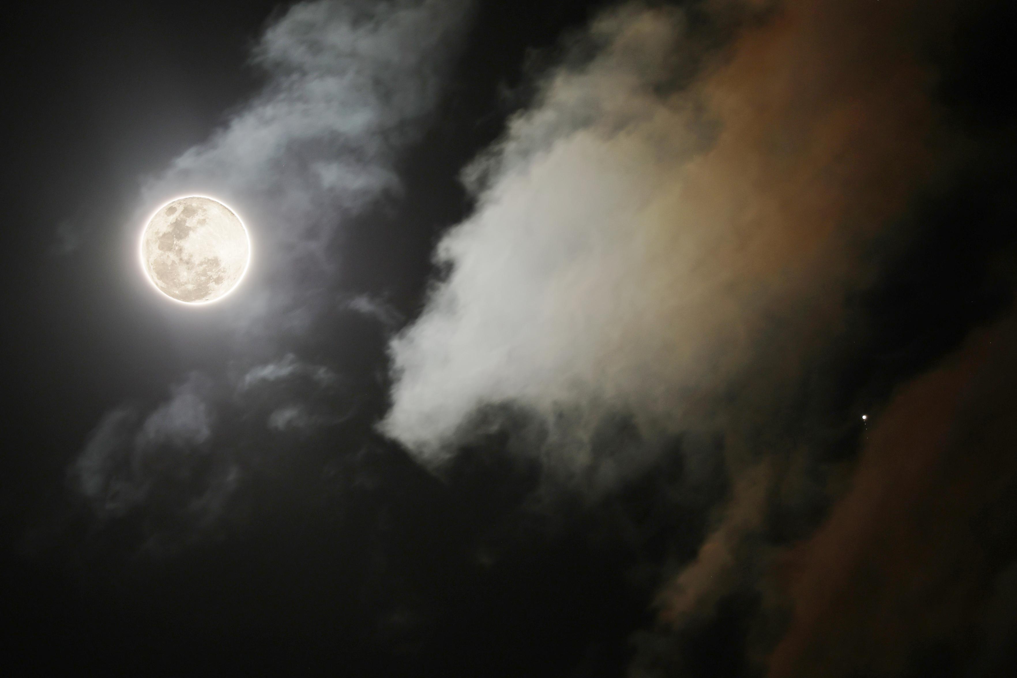 La Lune et Jupiter (et ses quatre lunes principales). Montage de deux photos pour voir la surface de la Lune, sinon elle serait toute blanche, mais le cadrage est le même.