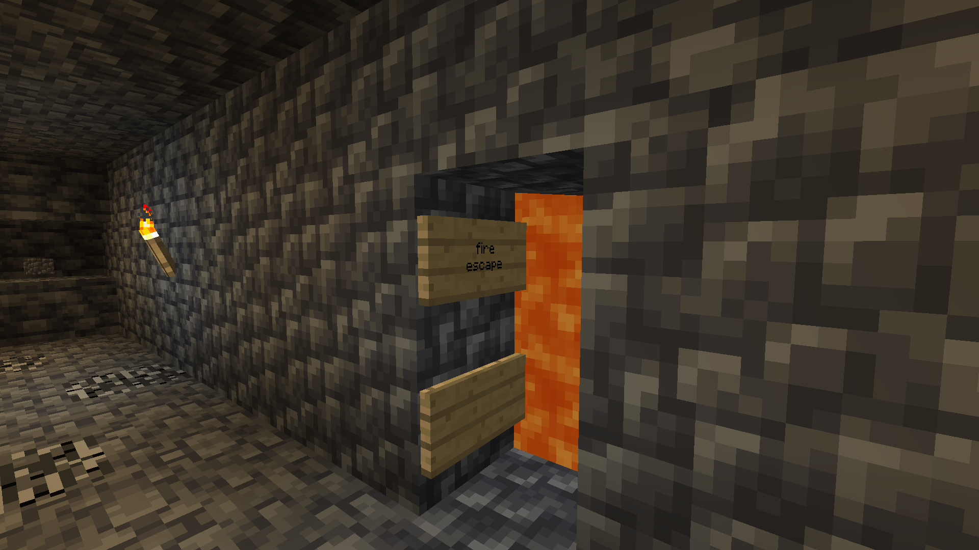 Minecraft screenshot showing a mine down in the deepslate layer, near bedrock. Two signs hold back some lava which is visible by a two high opening in the wall. One of the signs says "Fire Escape"