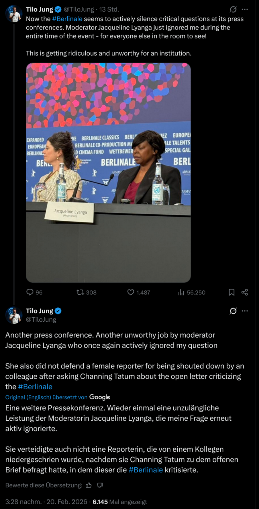 >> Silencing at #Berlinale after reporter Kira Müller asks actor Channing Tatum today about the open letter by 100+ Hollywood artists criticizing the festival for "silence" on Gaza...