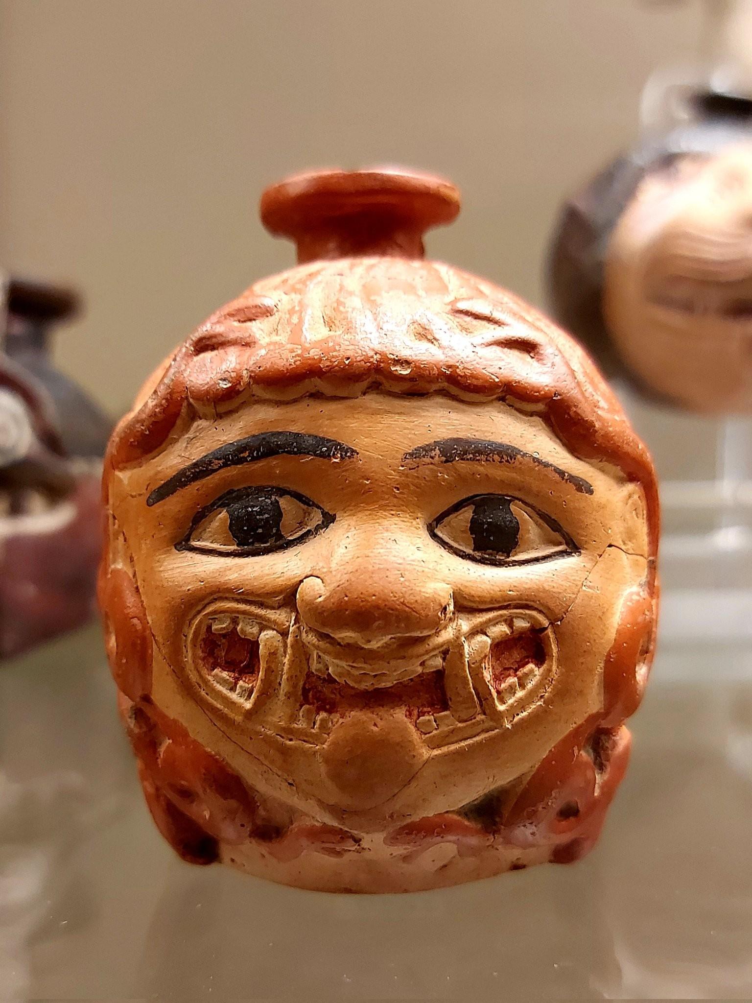 An aryballos in the shape of Medusa's head. The vessel was used to hold perfumes oil.