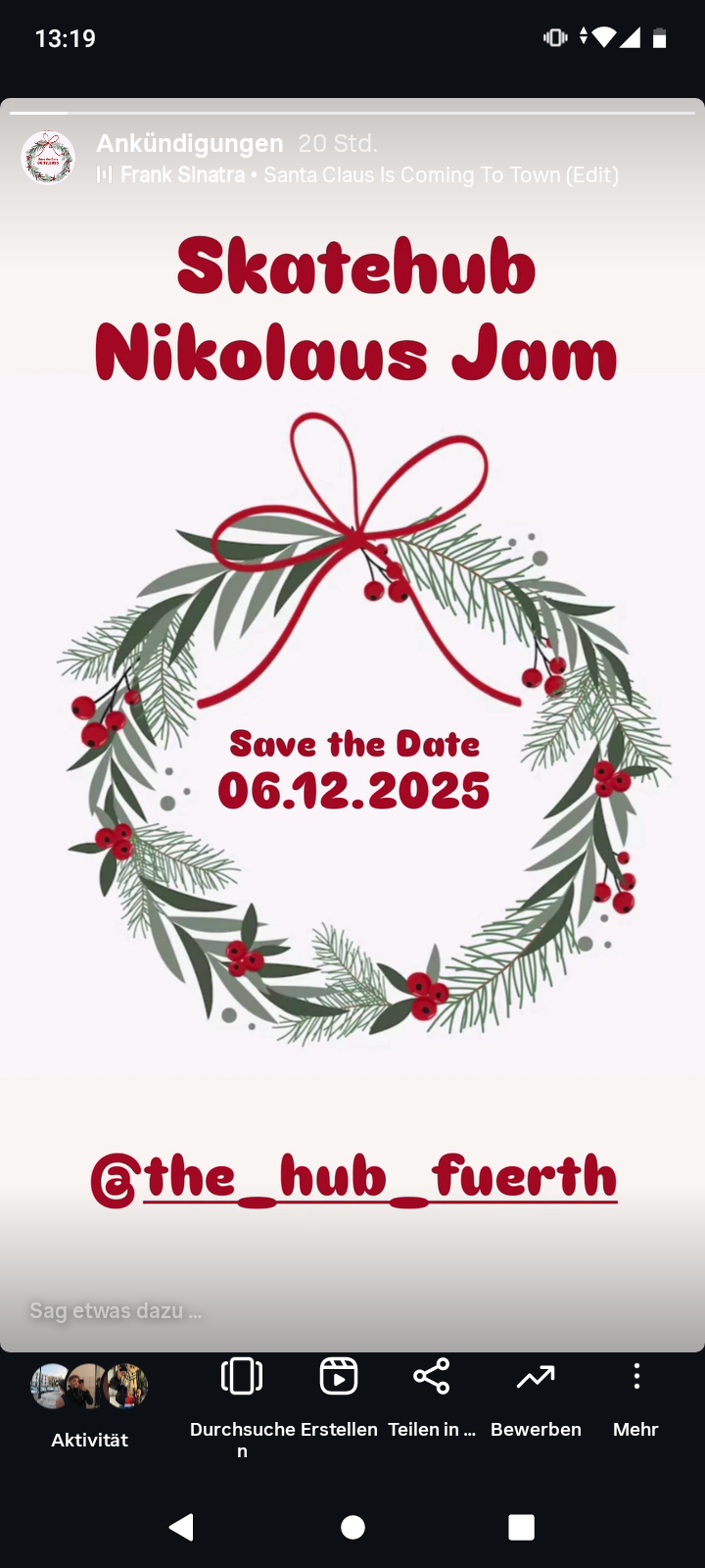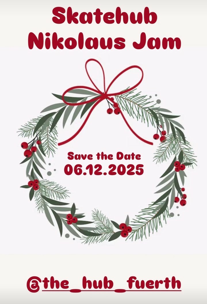 Könnt ihr schon mal in euren Kalender eintragen. Am Samstag den 06.12.2025 findet ein Skatejam in der Halle in Fürth für Skateboards statt.