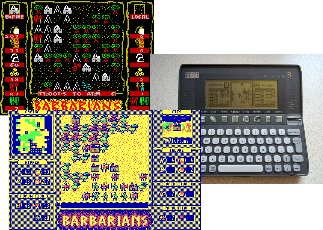 But the development history of #Barbarians is much longer than that. #msdos is the third platform for which I've released the game. The original version goes right back to 2010, when the game was developed for the once-popular range of pocket computers from #Psion, computers which are often sold short by being referred to as "PDAs." http://damian.cyningstan.org.uk/downloads/215/barbarians #gamedev