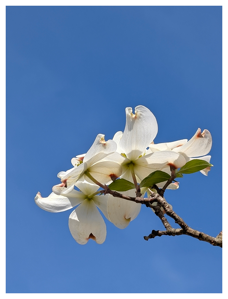 alt low-angle close-up of white dogwood flowers with touches of pink at the tips, blooming on a branch with a few green leaves, set against a clear, bright blue sky. low-angle close-up of white dogwood flowers with touches of pink at the tips, blooming on a branch with a few green leaves, set against a clear, bright blue sky.