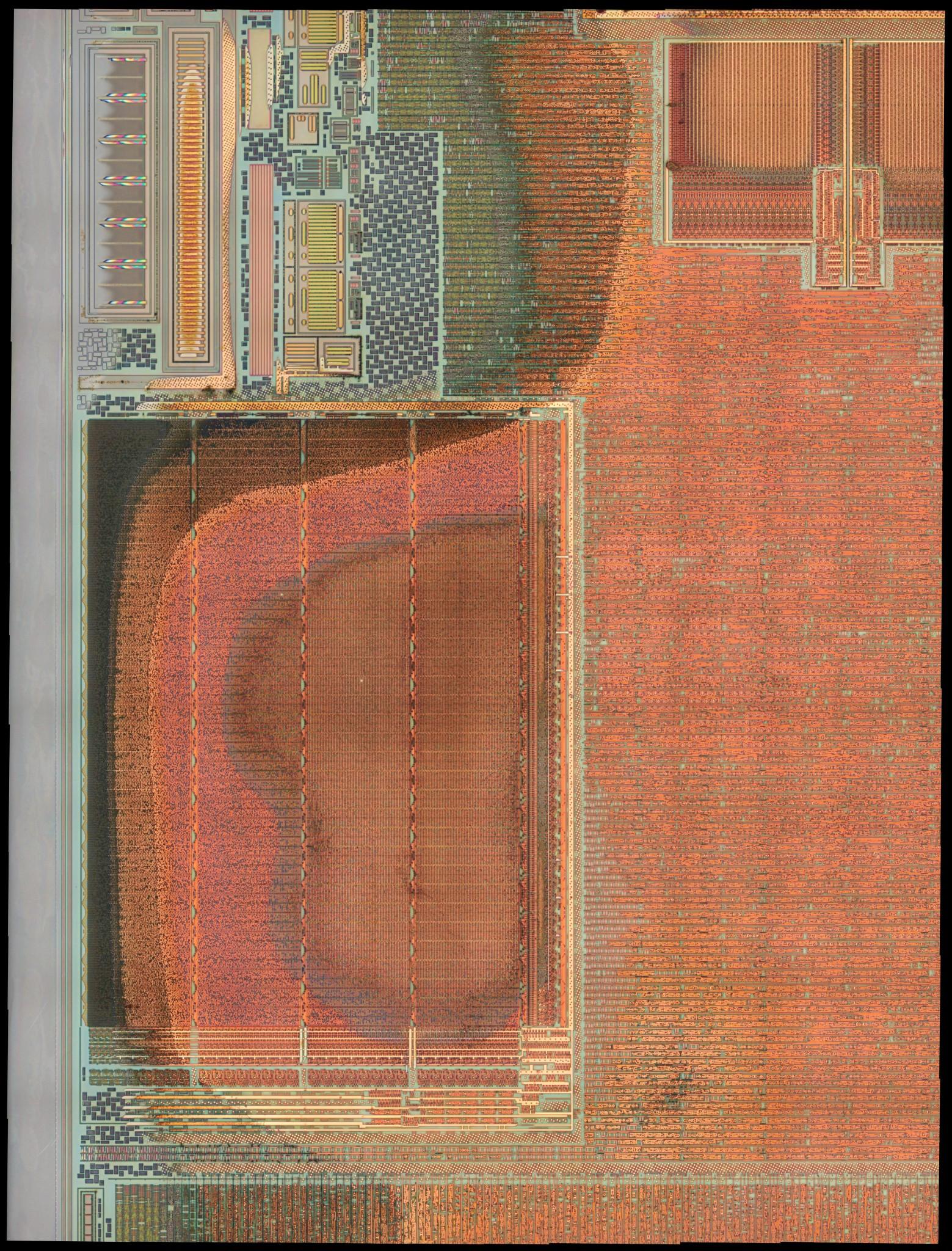 First semi-successful attempt at deprocessing by lapping. The outcome is extremely uneven, with metal2 remains showing over metal1, and a larger corner area being ground down to substrate.