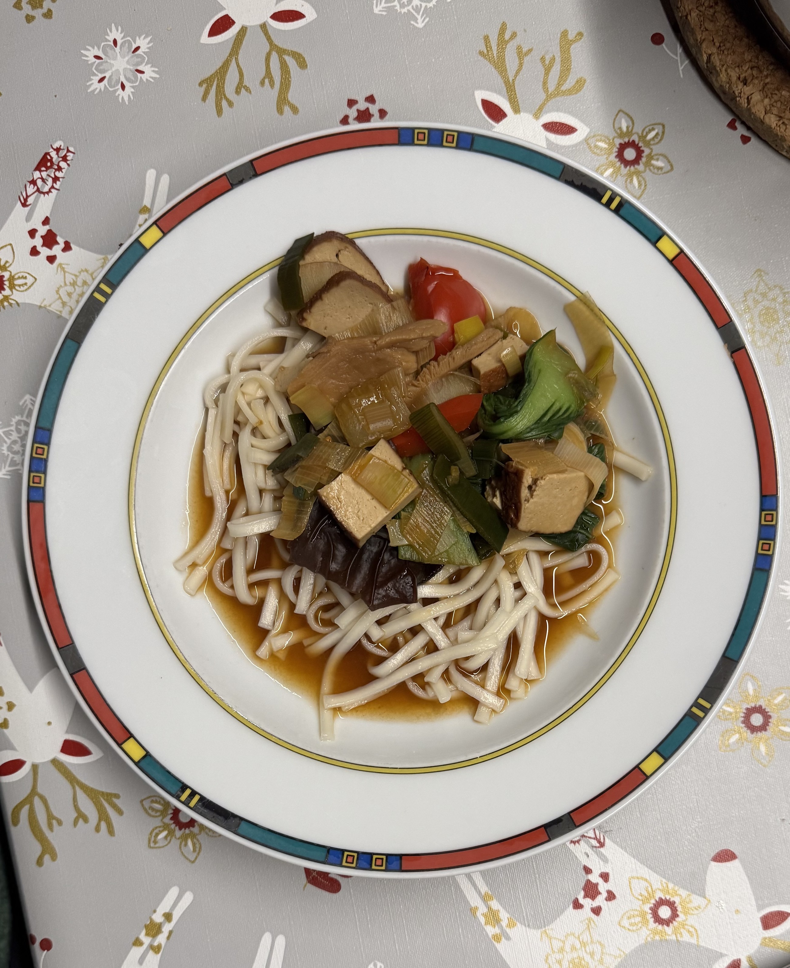 Am Start sind Udon-Nudeln mit Möhren, Pilz-Mix, Paprika, Stangenlauch, Pak Choi, Räuchertofu und Sud aus Misopaste und Gemüsebrühe. #vegan