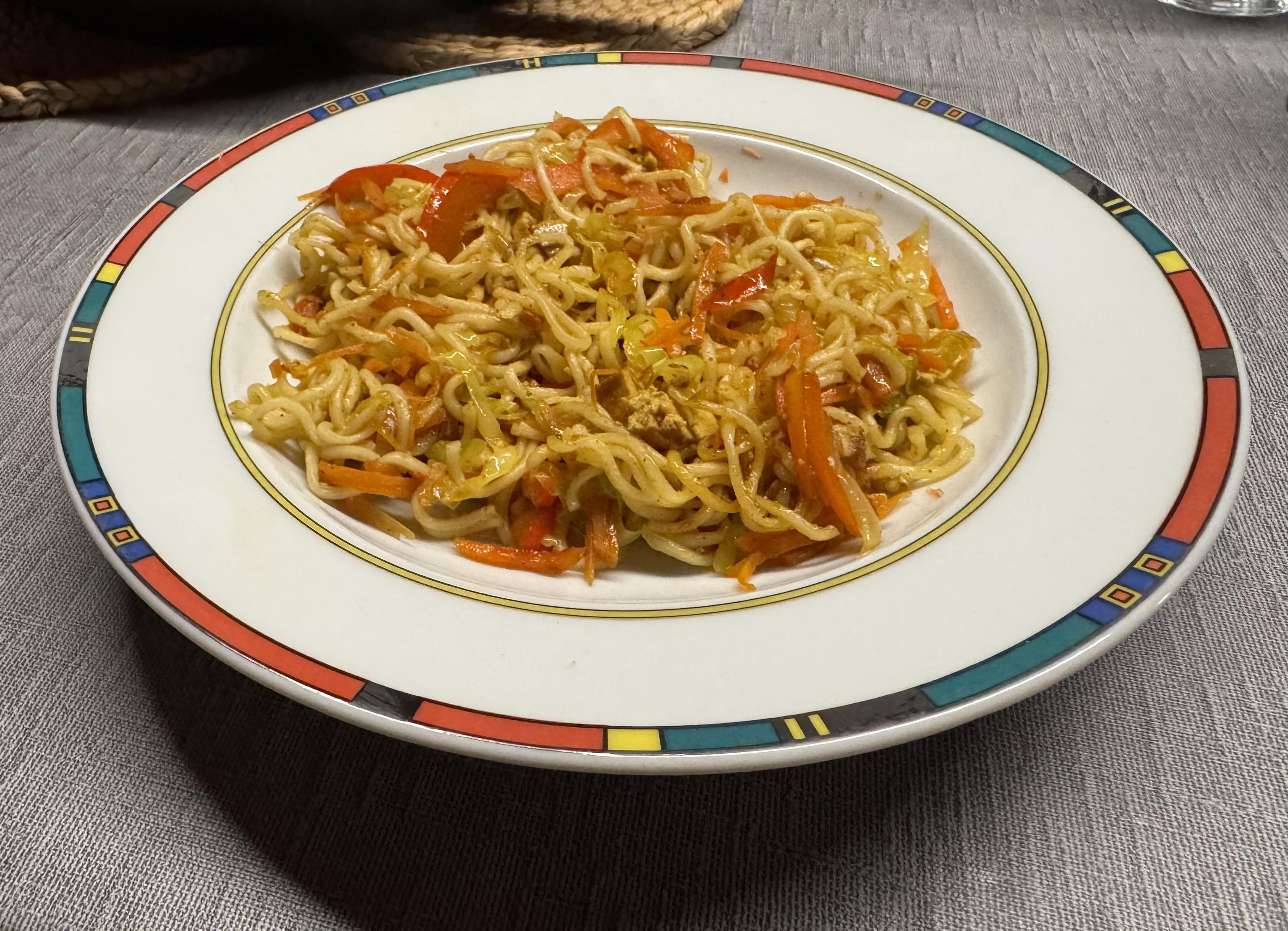 Heute eine Nudel-Pfanne: Mi-Nudeln, Mohrrübe, Spitzkohl, Paprika, gewürzter Tofu, Zwiebel, Knoblauch, Ingwer, Sojasauce und weitere Gewürze.