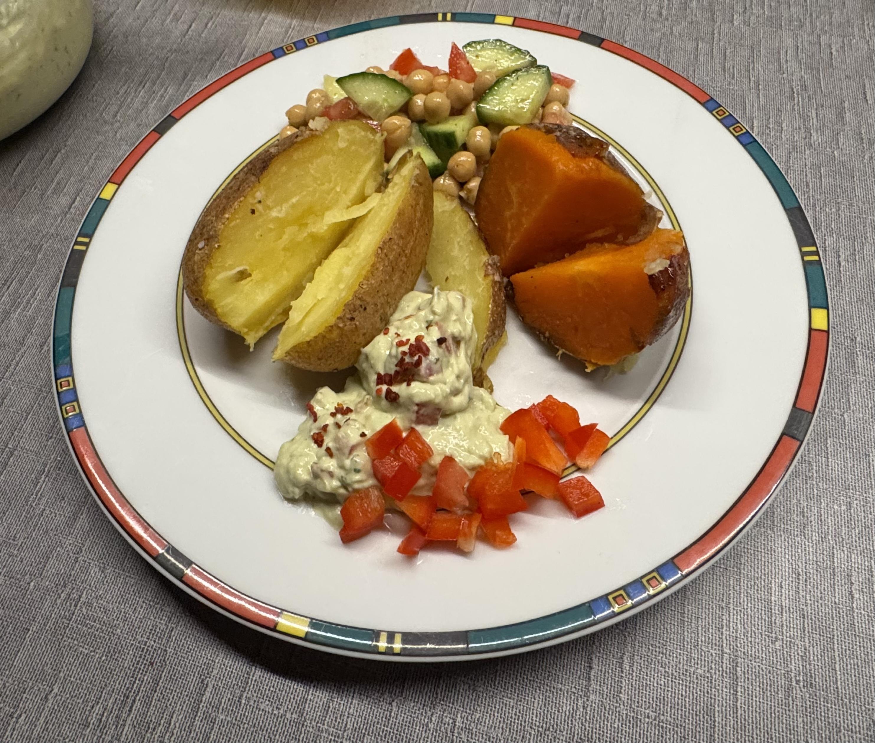 Ofenkartoffeln (Standard/Süß) mit Avocado-Schmand-Dip (plus Paprika-Tomaten-Mix). Als Proteinbeilage war ein Kichererbsensalat (mit Tomate, Salatgurke & Zwiebel) dabei.
