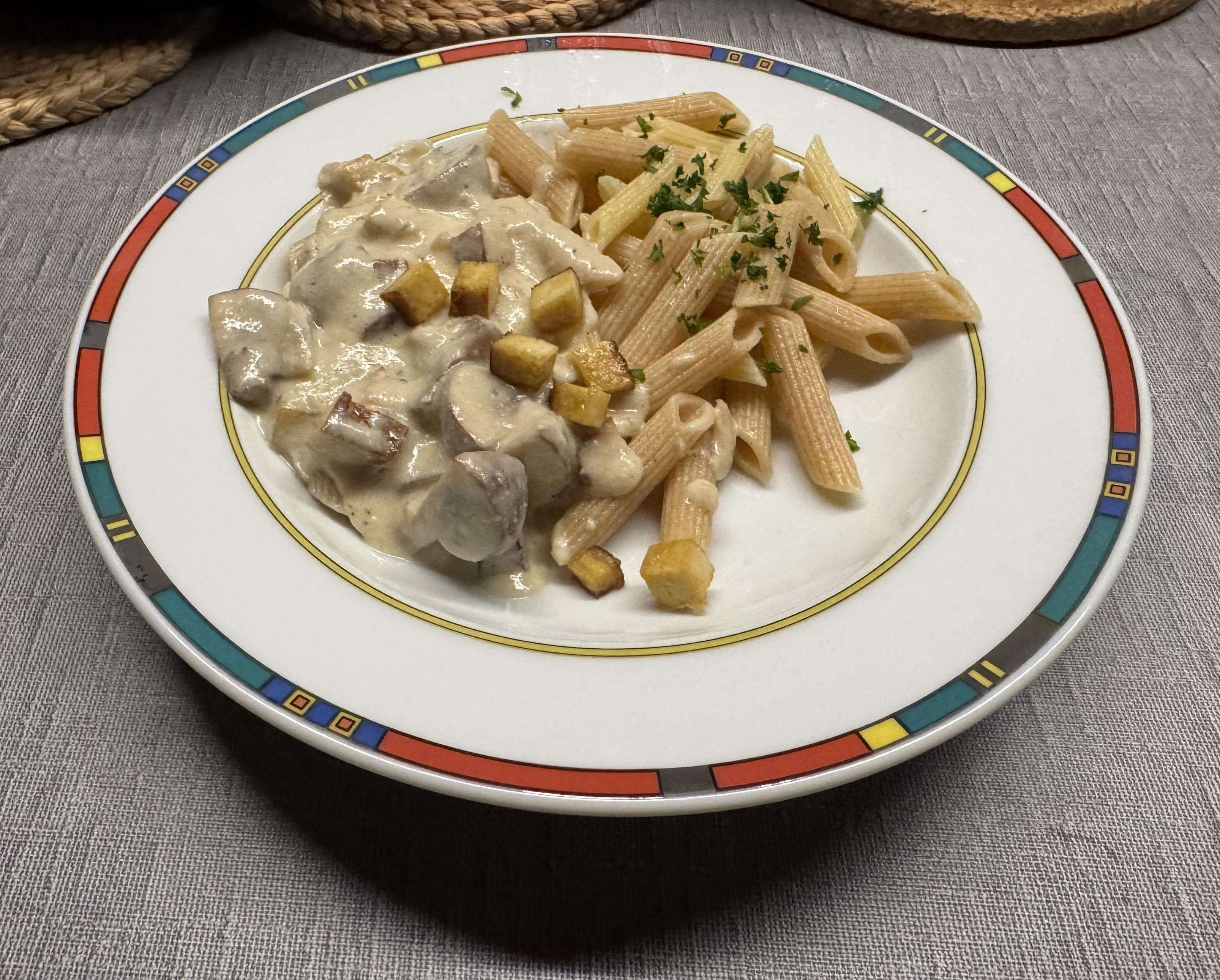 Mit Würfeln aus geräuchertem Tofu, Champignons, Cashewsahnesoße, Zwiebeln, Zitronensaft und Gewürzen. Bestreuselt mit Petersilie.