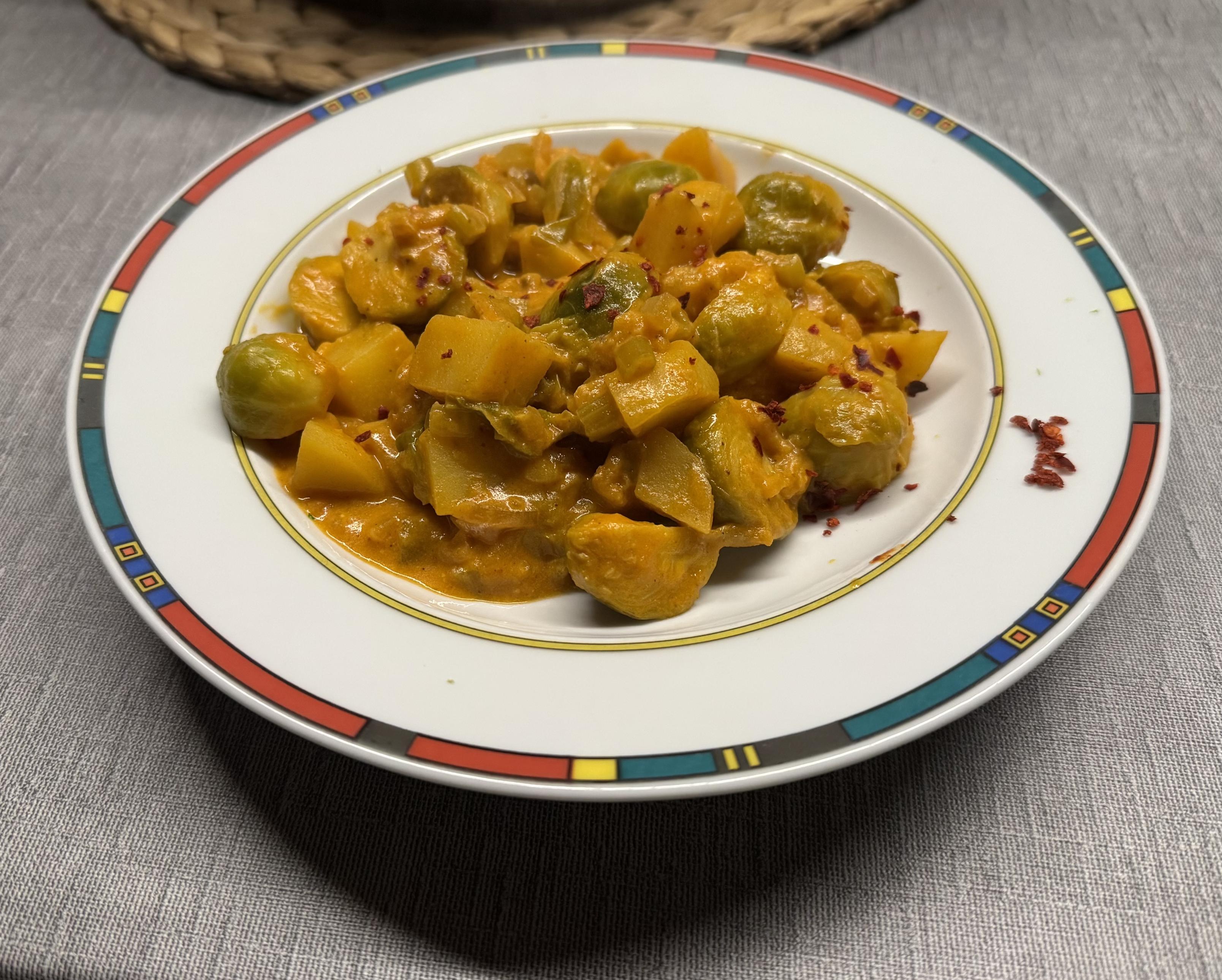 Heute ein Rosenkohl-Curry mit Kartoffeln, Staudensellerie, Zwiebeln, Rosinen, Banane, Gemüsebrühe, Kochsahne und diversen Gewürzen. Ein paar Chilliflocken dürfen auch nicht fehlen 🌶️