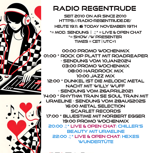 🇩🇪 Plakat mit den heutigen Radiosendungen. Bild (ohne Text): Pixabay, kein Bildquellennachweis erforderlich. 🇬🇧 Poster with details of today's radio shows. Image (without text): Pixabay, no image creds needed.