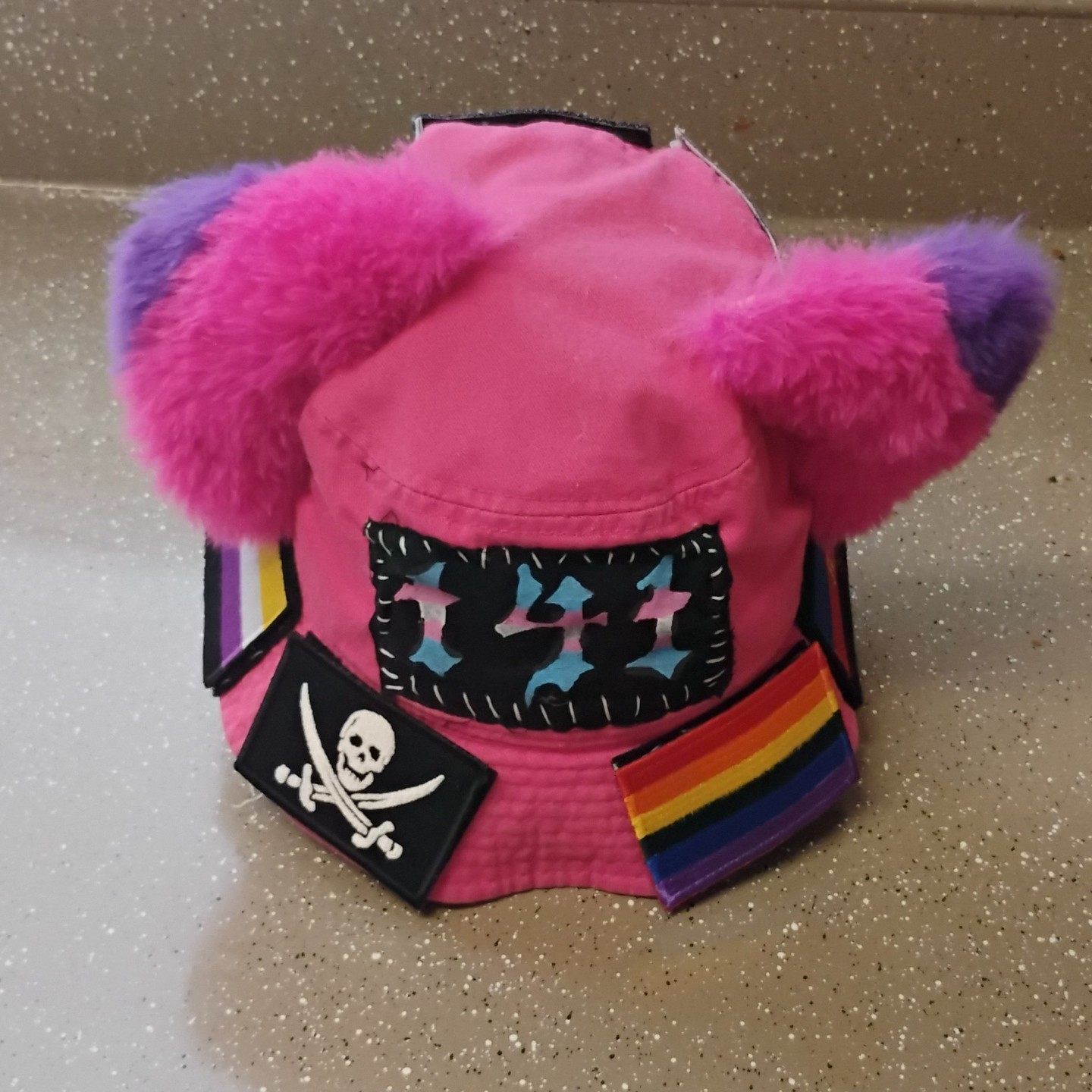 back of my hot pink bucket hat with cat ears and patches sewn on. there's a T4T patch and pirate flag and rainbow flag