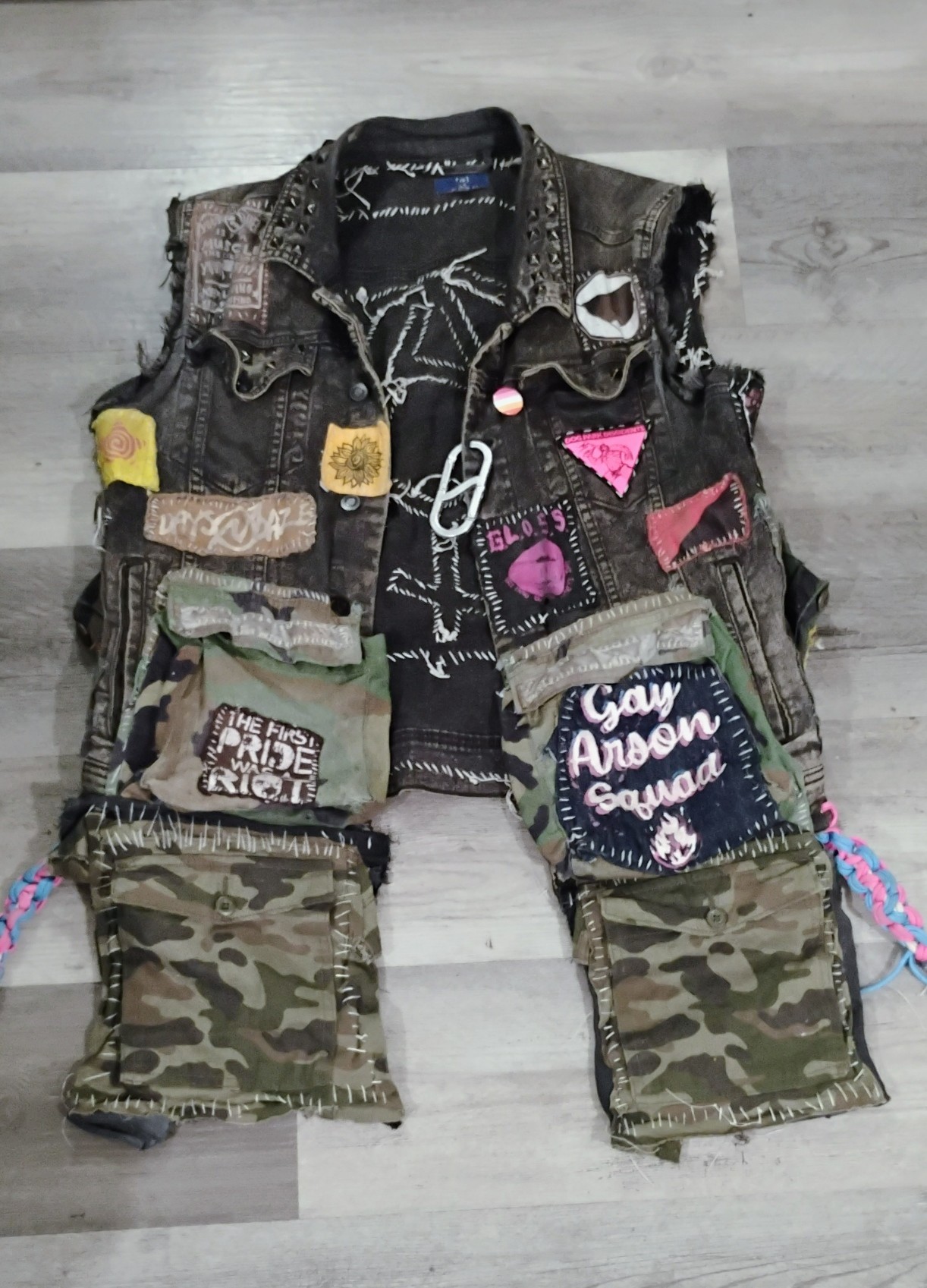 front of the Vest Of Holding my punk vest. there are new pockets sewn hanging off the front