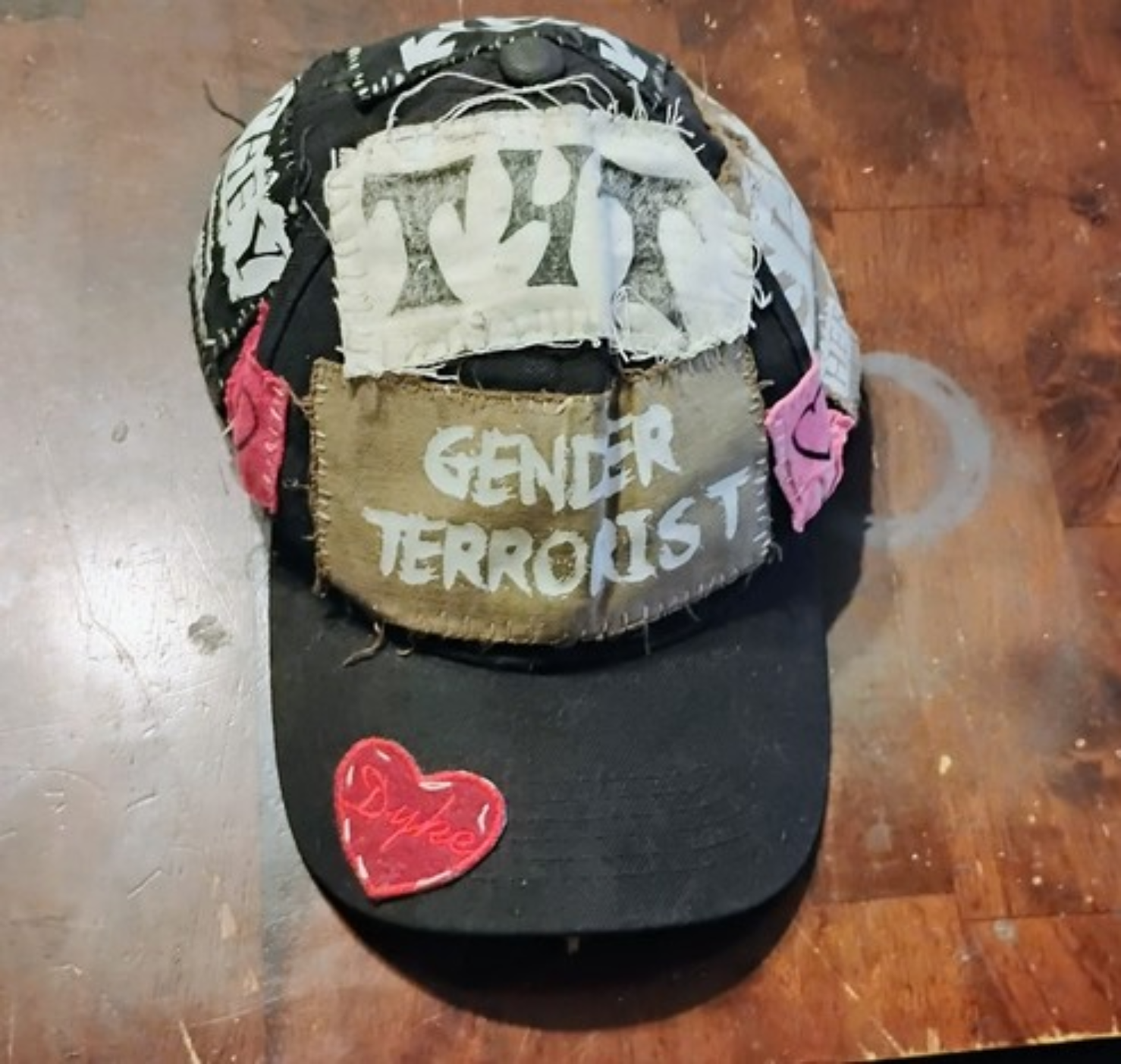 back of the Vest Of Holding, the reflective tape tranarchy symbol lit by the camera flash