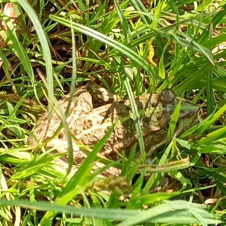 so ein frosch (am baggersee im juni '25) ist schon in etwas gras sehr gut versteckt :{)