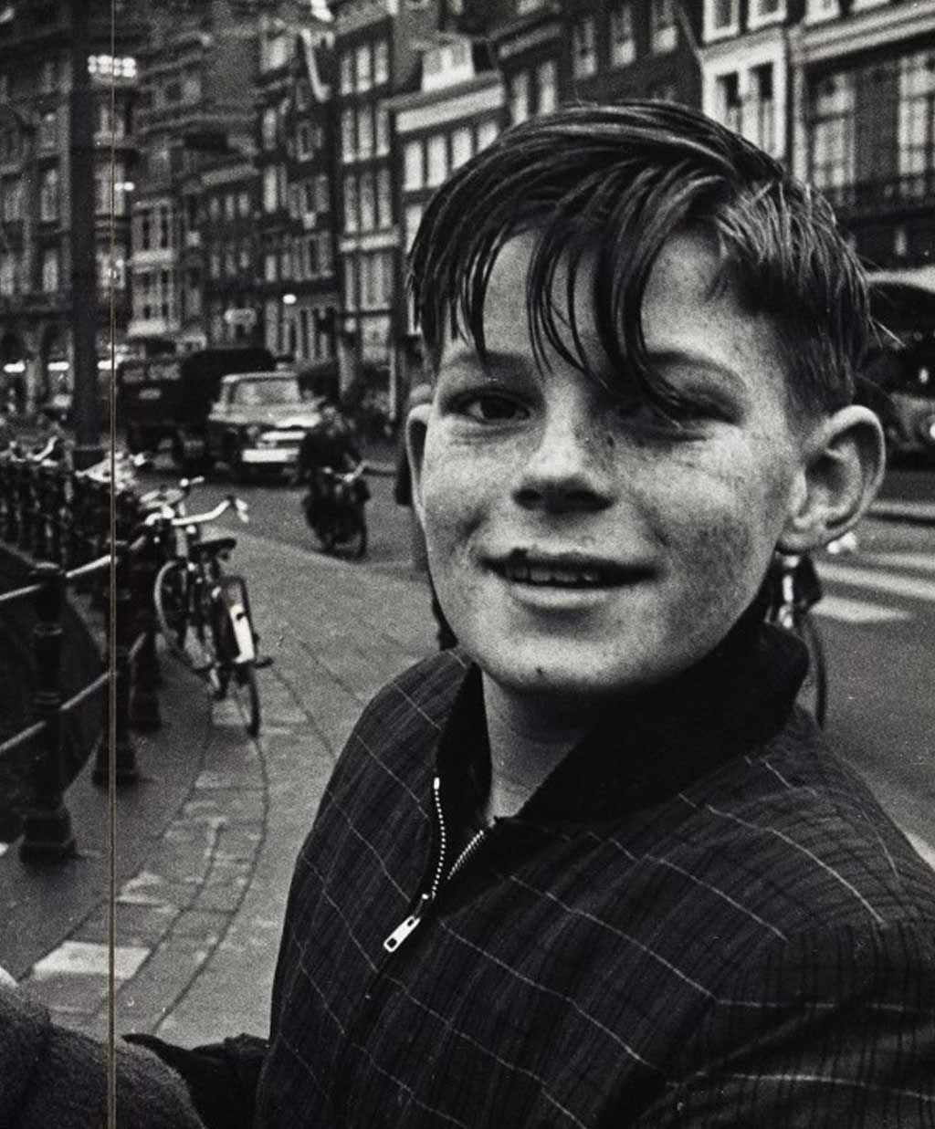 The image is a black and white photograph featuring the portrait of an individual, presumably named Ed van der Elsken. The person appears to be a young boy with wet hair, suggesting he may have been outside in rainy weather or engaged in some activity that got him soaked. He has stubble on his face and visible acne scars, which could indicate adolescence. His smile is wide and playful, displaying uneven teeth. He's wearing what looks like a dark plaid shirt over another garment with a high collar. The background shows an urban street scene filled with elements typical of European cities in the mid-20th century: bicycles parked along the sidewalk, pedestrians walking by, cars on the road, and architectural buildings that have windows visible. The setting seems busy yet organized. There's also some foliage to one side which adds a touch of greenery. This photograph could be capturing an everyday moment from Ed van der Elsken’s life or work as suggested by additional information indicating it might relate to YAZU!, possibly referencing his connection with the photographer Kazuo Nakamura, known for documenting Japanese youth culture. The image is likely part of a larger collection showcasing different aspects of urban life during that era. It's important to note that Ed van der Elsken was actually an internationally acclaimed Dutch street and documentary photographer rathe [...]