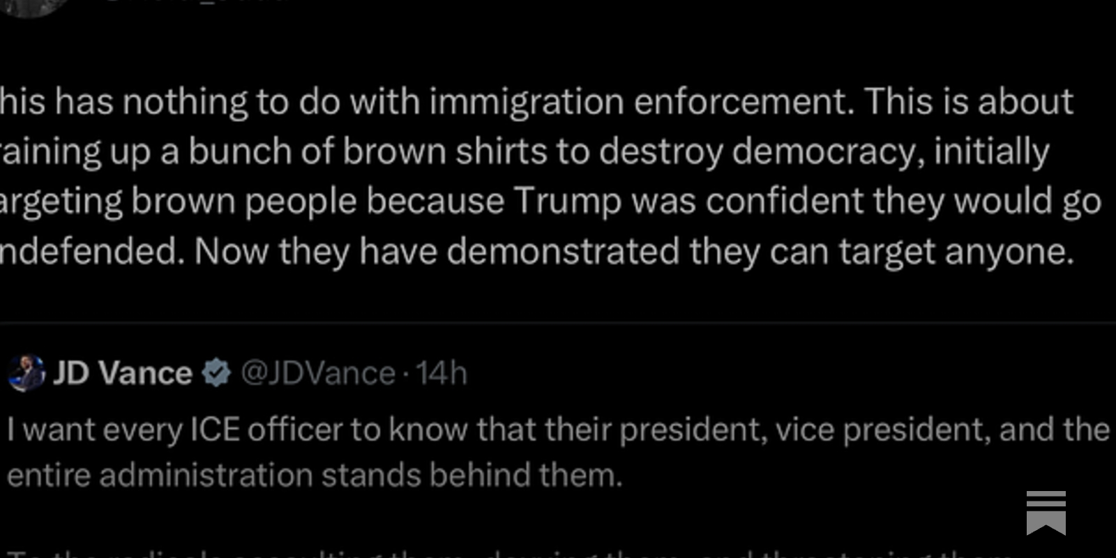 “This has nothing to do with immigration enforcement. This is about training up a bunch of brown shirts to destroy democracy, initially targeting brown people because Trump was confident they would go undefended. Now they have demonstrated they can and will target anyone, and cover up for cold-blooded murder.”