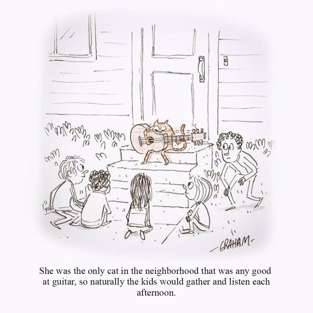 alt A cartoon illustration of an orange cat playing guitar on the front steps of a house as children gather around to listen. Caption reads "She was the only cat in the neighborhood that was any good at guitar, so naturally the kids would gather and listen each afternoon." A cartoon illustration of an orange cat playing guitar on the front steps of a house as children gather around to listen. Caption reads "She was the only cat in the neighborhood that was any good at guitar, so naturally the kids would gather and listen each afternoon."