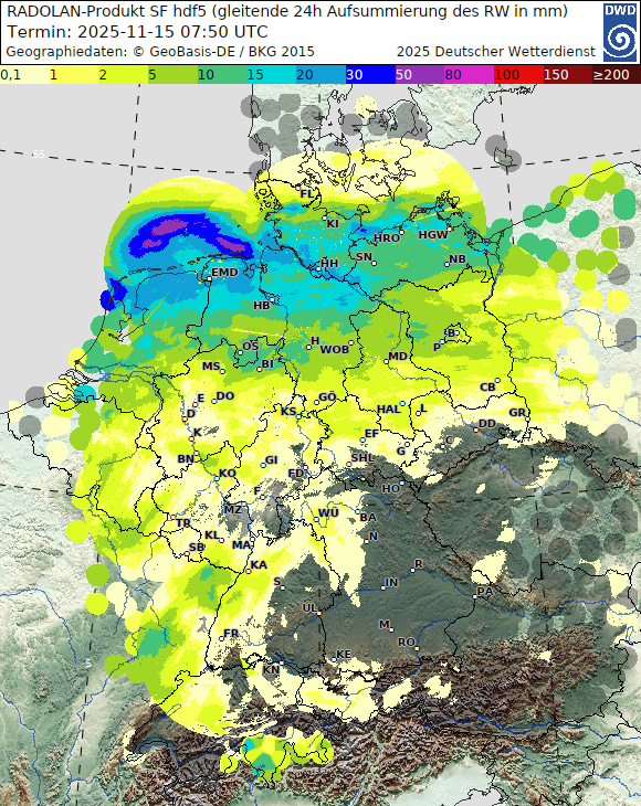 Im Nordwesten in den letzten 24 Stunden verbreitet mehr als 20 Liter Regen pro m², in Emden 30 Liter: https://www.wetterkontor.de/de/wetter/deutschland/extremwerte.asp?id=20251114