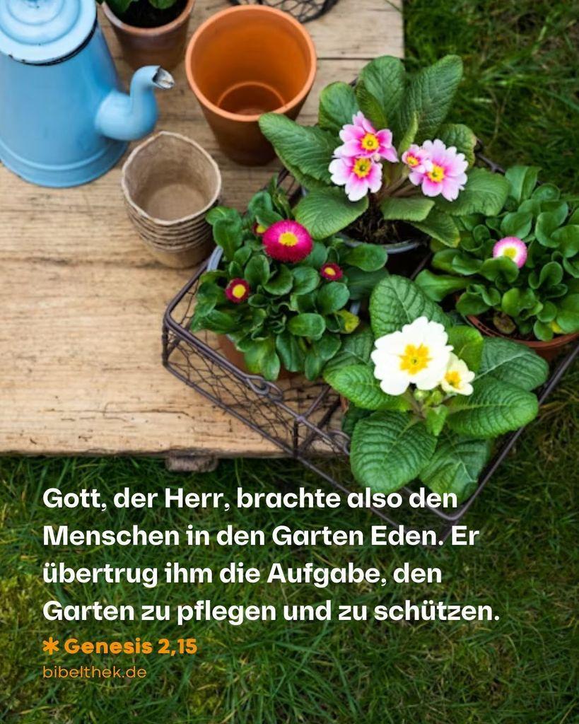 Gott, der Herr, brachte also den Menschen in den Garten Eden. Er übertrug ihm die Aufgabe, den Garten zu pflegen und zu schützen.