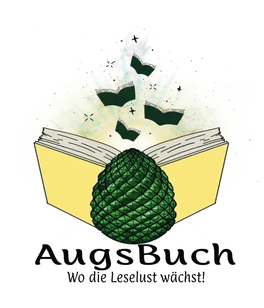 Das Logo der Messe AugsBuch. Ein aufgeschlagenes Buch mit gelbem Umschlag, davor etwas, das wie ein grüner Kiefernzapfen aussieht. Dahinter mehrere aufgeschlagene Bücher, die zu fliegen scheinen. Darunter steht AugsBuch, wo die Leselust wächst.