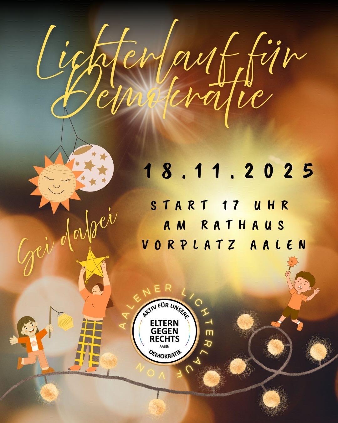 Das Foto zeigt eine Gruppe von Menschen, die sich vor einem Gebäude mit großen Fenstern und Treppen im Hintergrund versammelt haben. Im Zentrum des Bildes halten mehrere Personen ein großes, weißes Banner, das mit Lichterketten umrandet ist. Auf dem Banner steht in roter und schwarzer Schrift "Lichterlauf für Demokratie" und "Eltern gegen rechts". Einige gelbe Sterne sind auch auf dem Banner abgebildet.