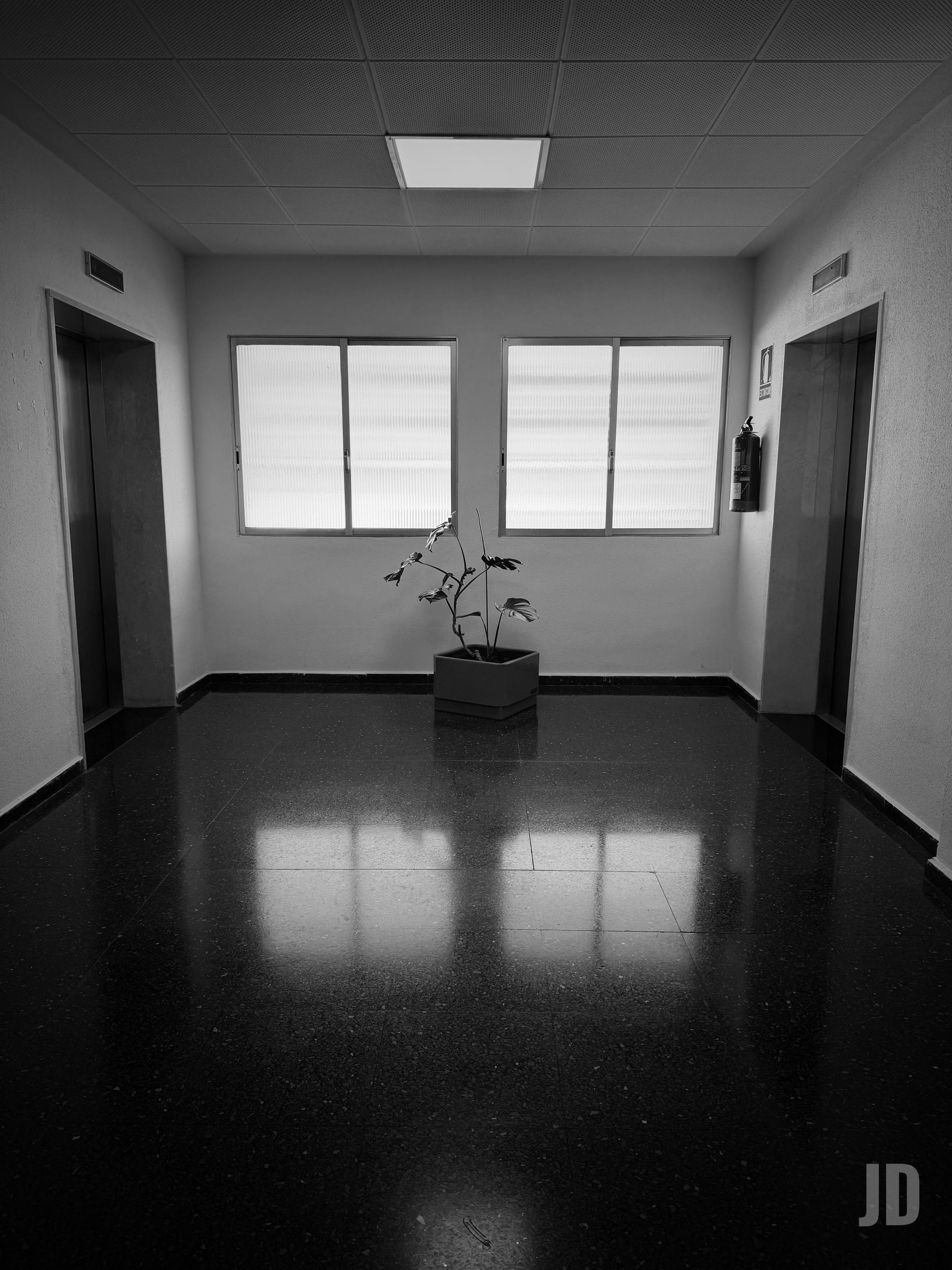 Fotografía en blanco y negro que captura el vestíbulo de un edificio con una atmósfera minimalista y algo melancólica. La imagen es altamente simétrica. En el centro se encuentra una planta en una maceta cuadrada, situada frente a dos ventanas rectangulares que dejan pasar una luz suave y difusa. A los lados se aprecian dos huecos de ascensor y, a la derecha, un extintor colgado en la pared. El suelo es oscuro y brillante, lo que genera un reflejo nítido de las ventanas y la luz superior, creando un juego visual de luces y sombras que guía la mirada hacia el fondo. El uso del blanco y negro resalta las texturas geométricas del techo y el suelo, transmitiendo una sensación de soledad, orden o espera.